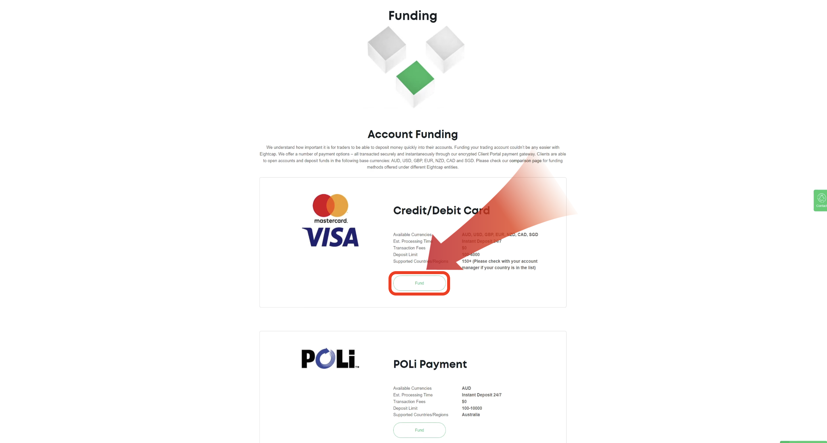 Eightcap accepts different deposit methods to your account. They offer 0 % fees, support more than 150 countries and offer an instant deposit starting at a minimum of 100 USD. In this example we choose “Credit/Debit Card” by clicking “Fund”.