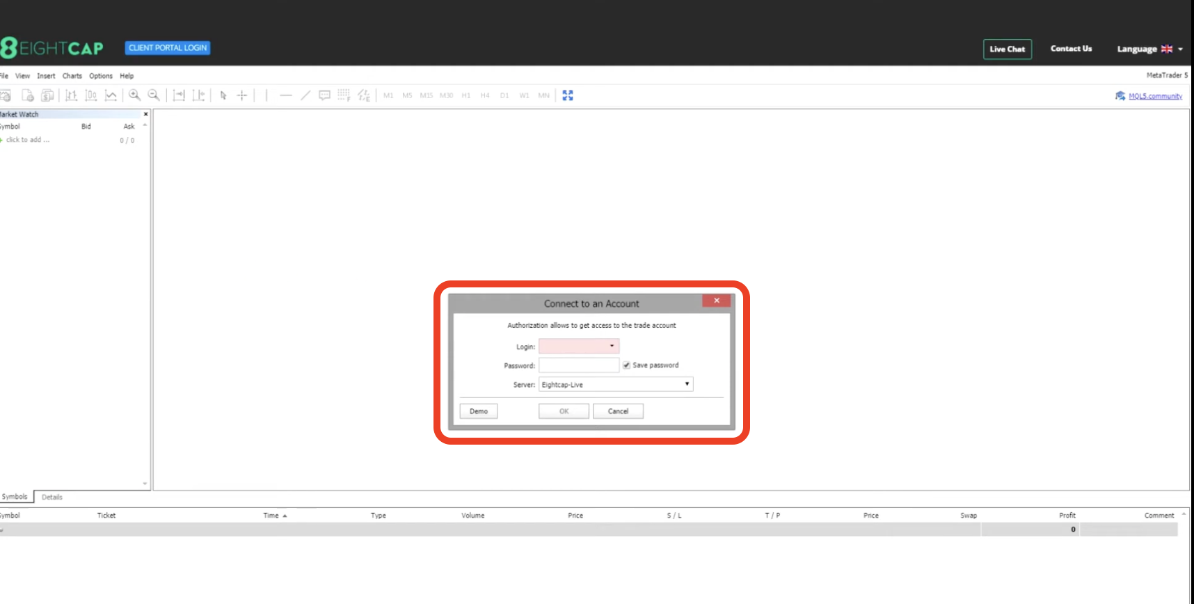 You can now connect Eightcap to an external trading platform. In this example we have chosen to connect the account to MetaTrader 5. Fill in your password, server and click “OK” when ready. You should now have full access to the platform.