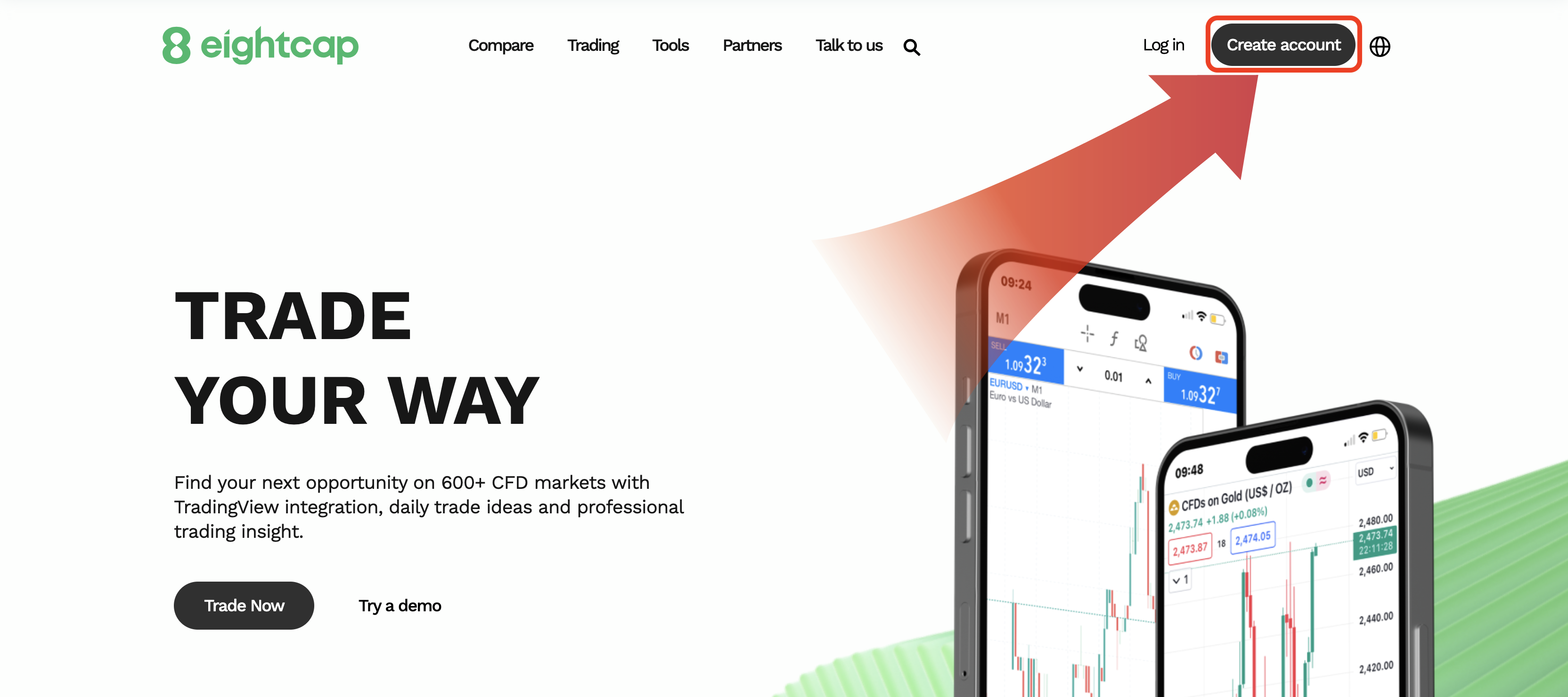 1. Go to Eightcaps’ website. 2. Register and set up an account. 3. Fund your account, at least 100 USD. 4. Connect account to trading platform. 5. Start trading by placing an order.