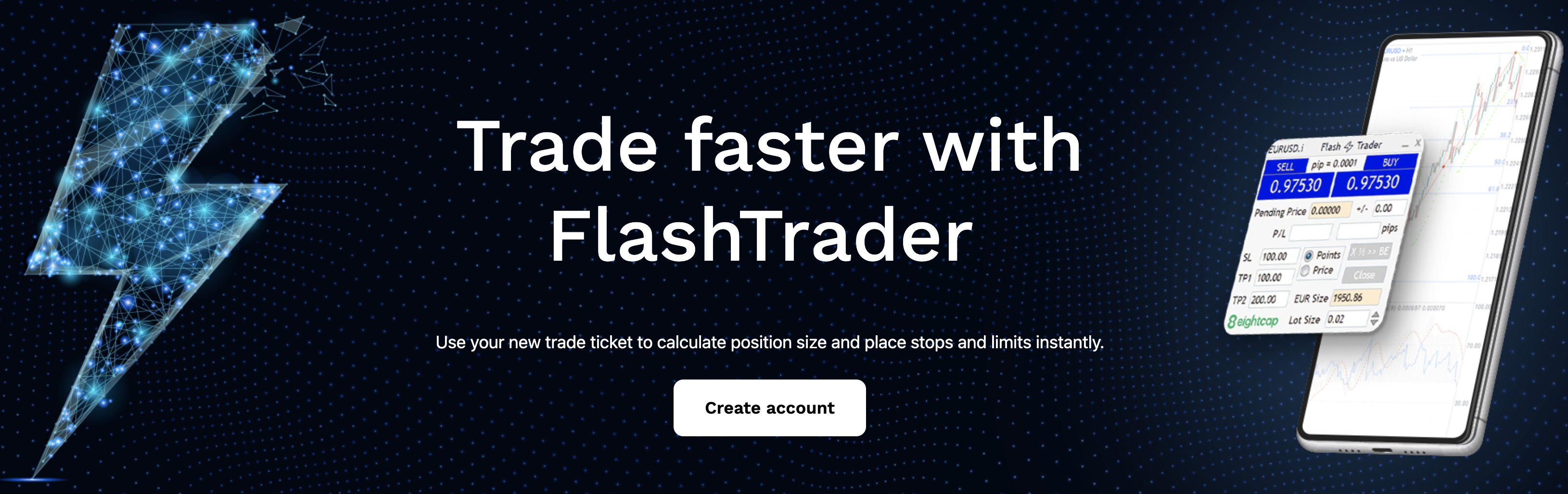 FlashTrader is an expert advisor (EA) plug‑in exclusively for MetaTrader 5 on Eightcap. It helps you place trades quickly and safely by doing the hard work for you, like calculating how much to risk, setting stop-losses and picking profit levels.