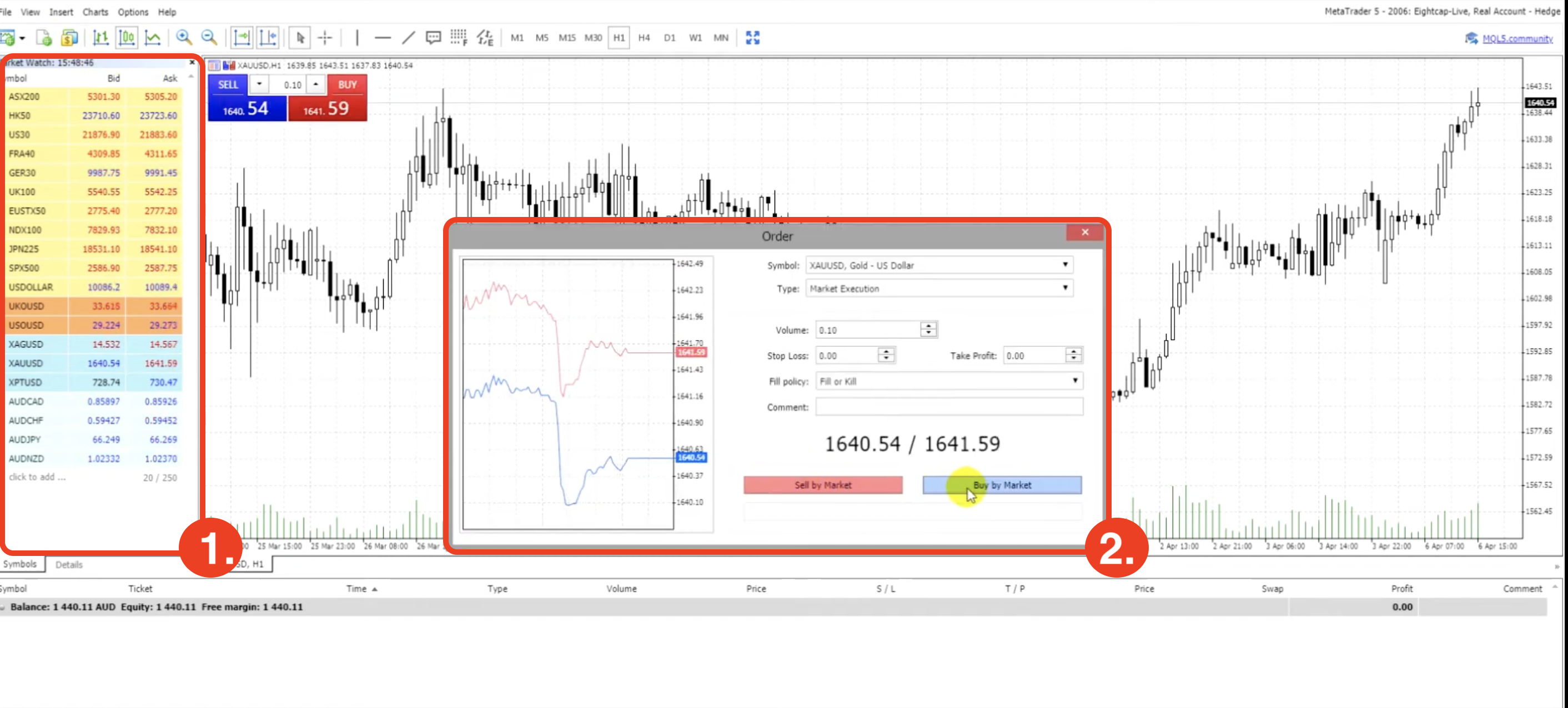 On the left side is the market watch window. From there you can select any available asset to trade by clicking on the instrument and selecting “New Order”.