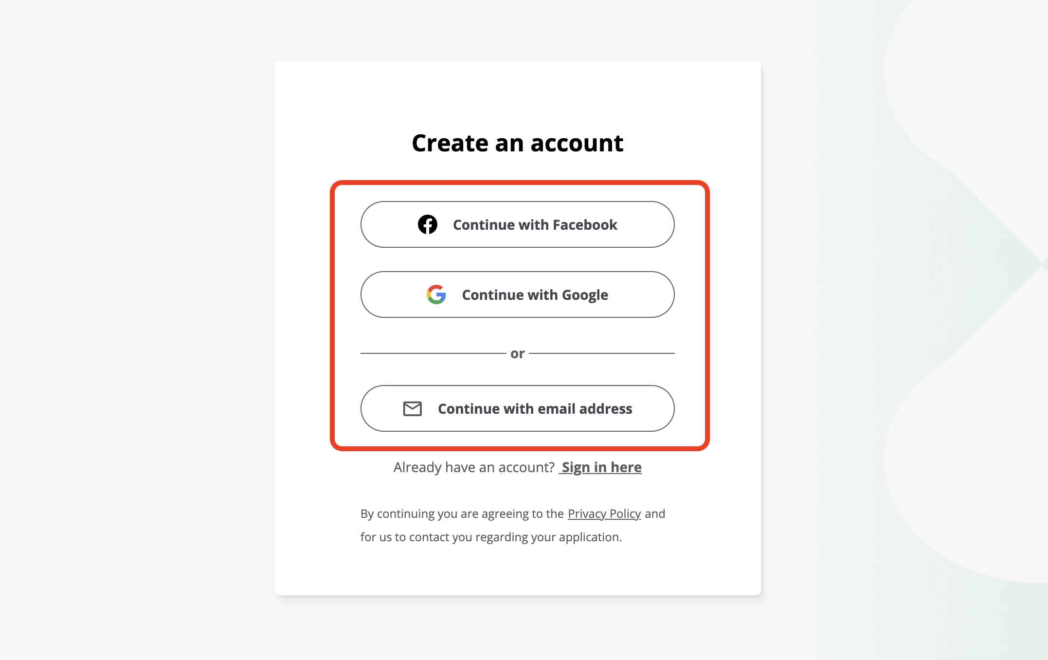 In this step you need to register an account. Register by either choosing Facebook, Google or email address. If you choose your email address, you will be sent a confirmation code.