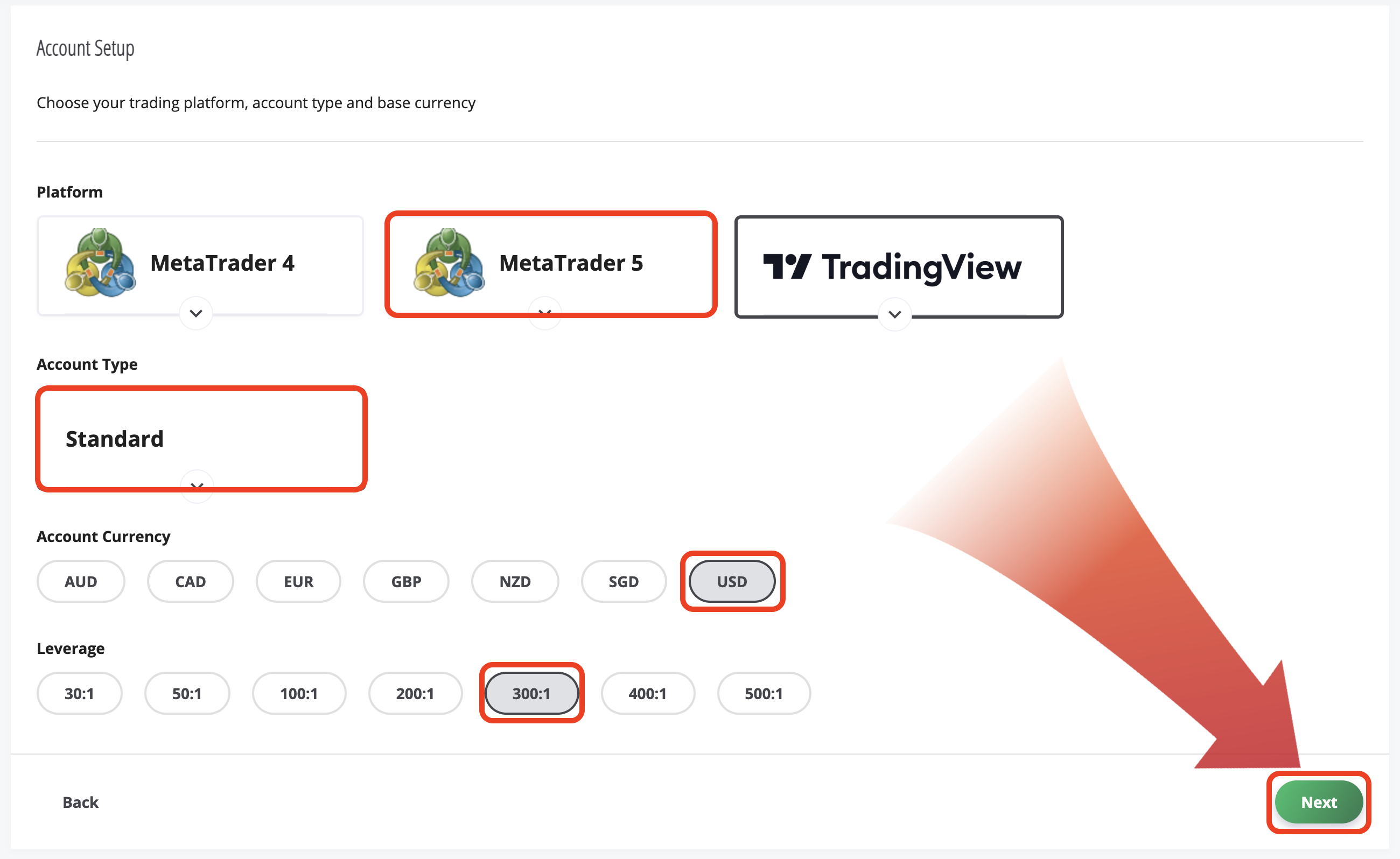 In this example we choose “MetaTrader 5” as our external platform, “Standard” as our account type, “USD” as our currency and “300:1” as our leverage ratio. Whenever ready, click “Next” to proceed.