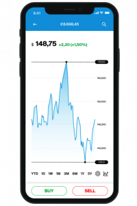 Ovan visas en skärmdump från hur Degiros aktieapp ser ut på en iPhone. Bilden visar kursutvecklingen för ett visst värdepapper. Längst ner kan du antingen välja att köpa eller sälja det givna värdepappret.