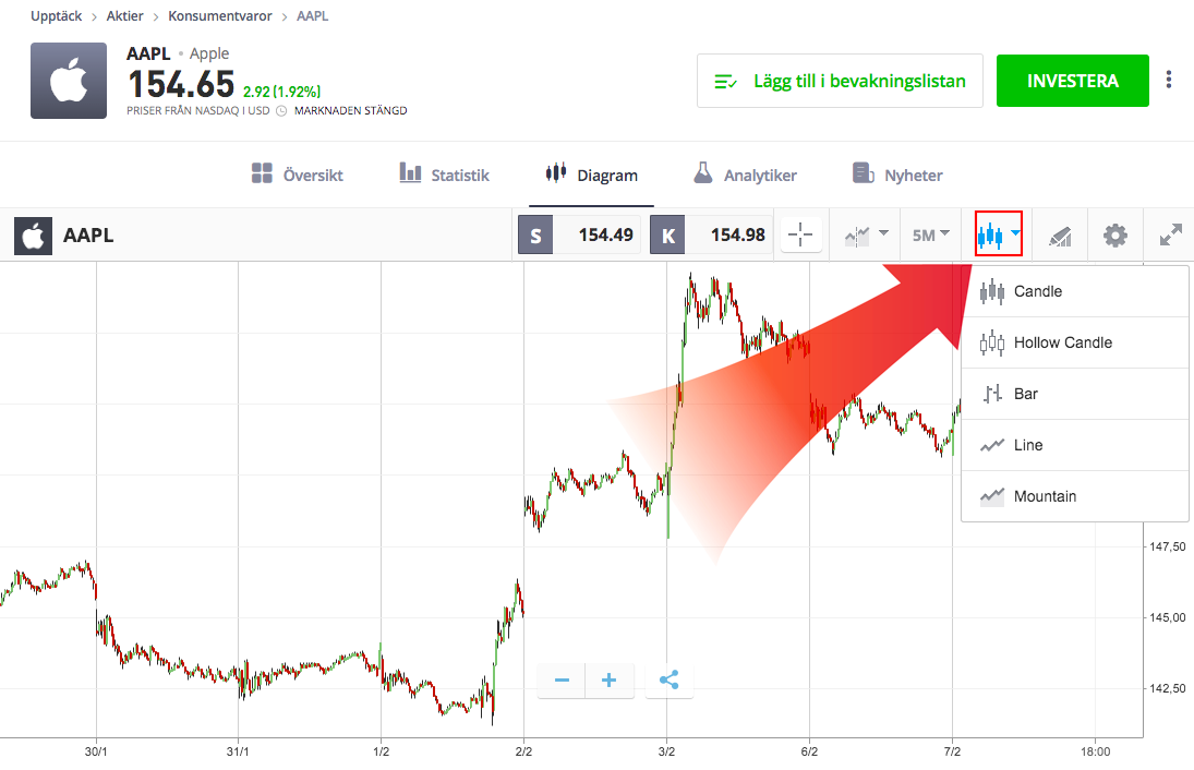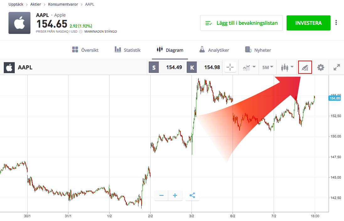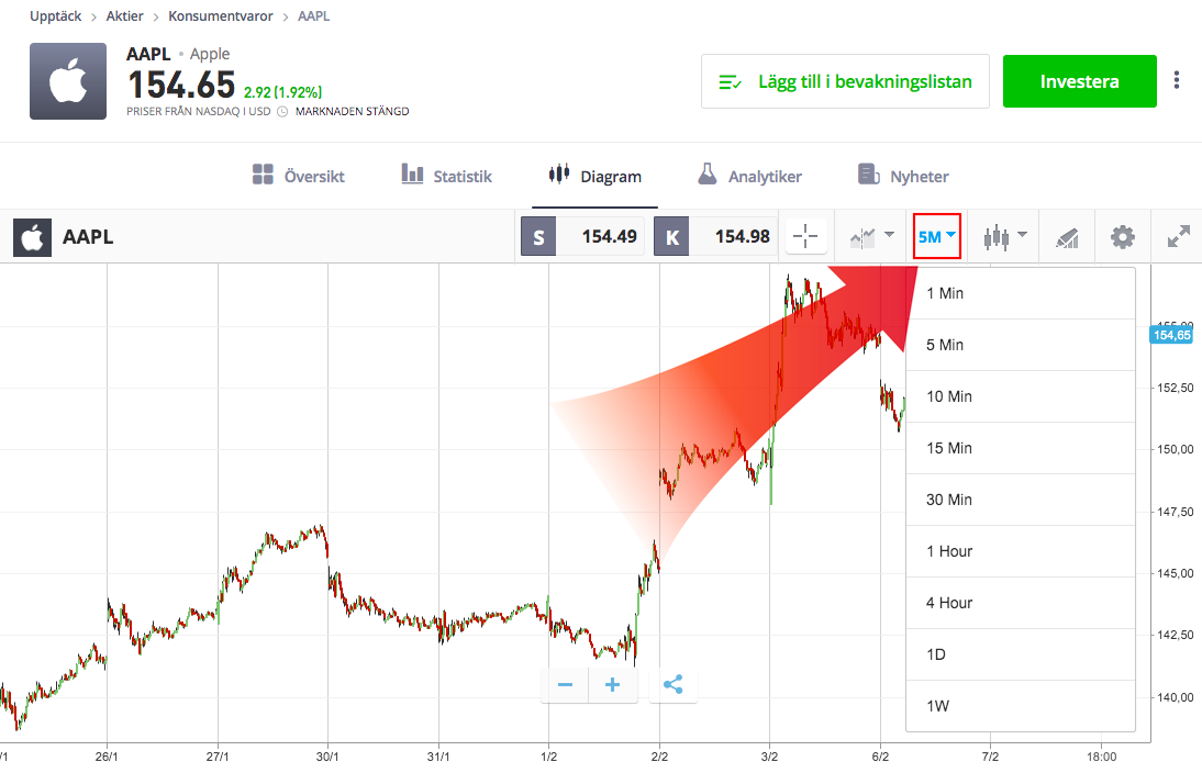 När du har pengar på ditt konto kan du välja en investering. I detta exempel väljer vi att köpa aktier i Apple (AAPL) genom att klicka på köpknappen.