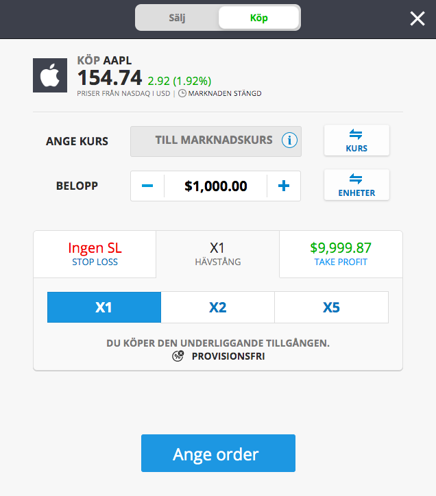 Sista steget är att ange beloppet. Klicka därefter på på ”Ange order” för att genomföra din investering.