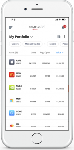 eToro erbjuder en av de mest användarvänliga aktieapparna på marknaden. De har framförallt fokuserat på att göra information lättförståelig. Nedan visas en skärmdump från en användares portfölj.