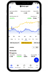 - Möjlighet till att agera snabbt – Den största fördelen med en aktieapp är möjligheten till att få en snabb överblick över din portfölj, oavsett vart du än befinner dig. Med några få knapptryck direkt i mobilen kan du göra snabba affärer, se innehav, diskutera med andra eller visa upp ditt innehav.