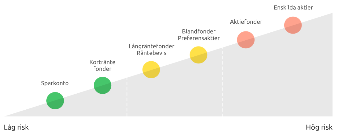 Enligt riskskalan nedan är aktier det klart mest riskfyllda värdepappret du kan äga, följt av olika typer av fonder och sparkonto.