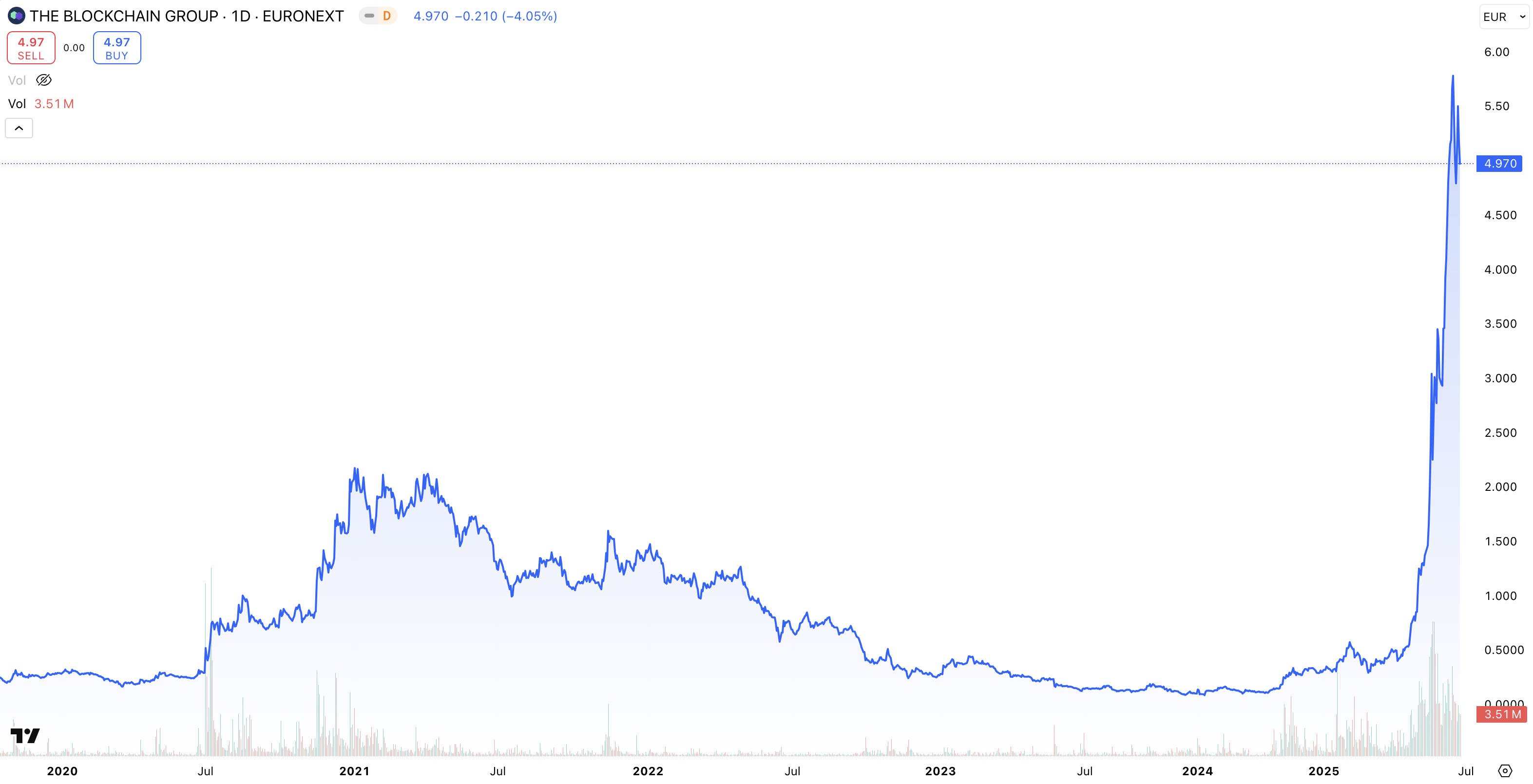 The Blockchain Group startade som ett franskt teknik- och konsultbolag. I november 2024 valde de att följa i fotspåren av Strategy genom att satsa på bitcoin. Sedan dess har de fört en offensiv investeringsstrategi för att bygga upp ett betydande innehav.