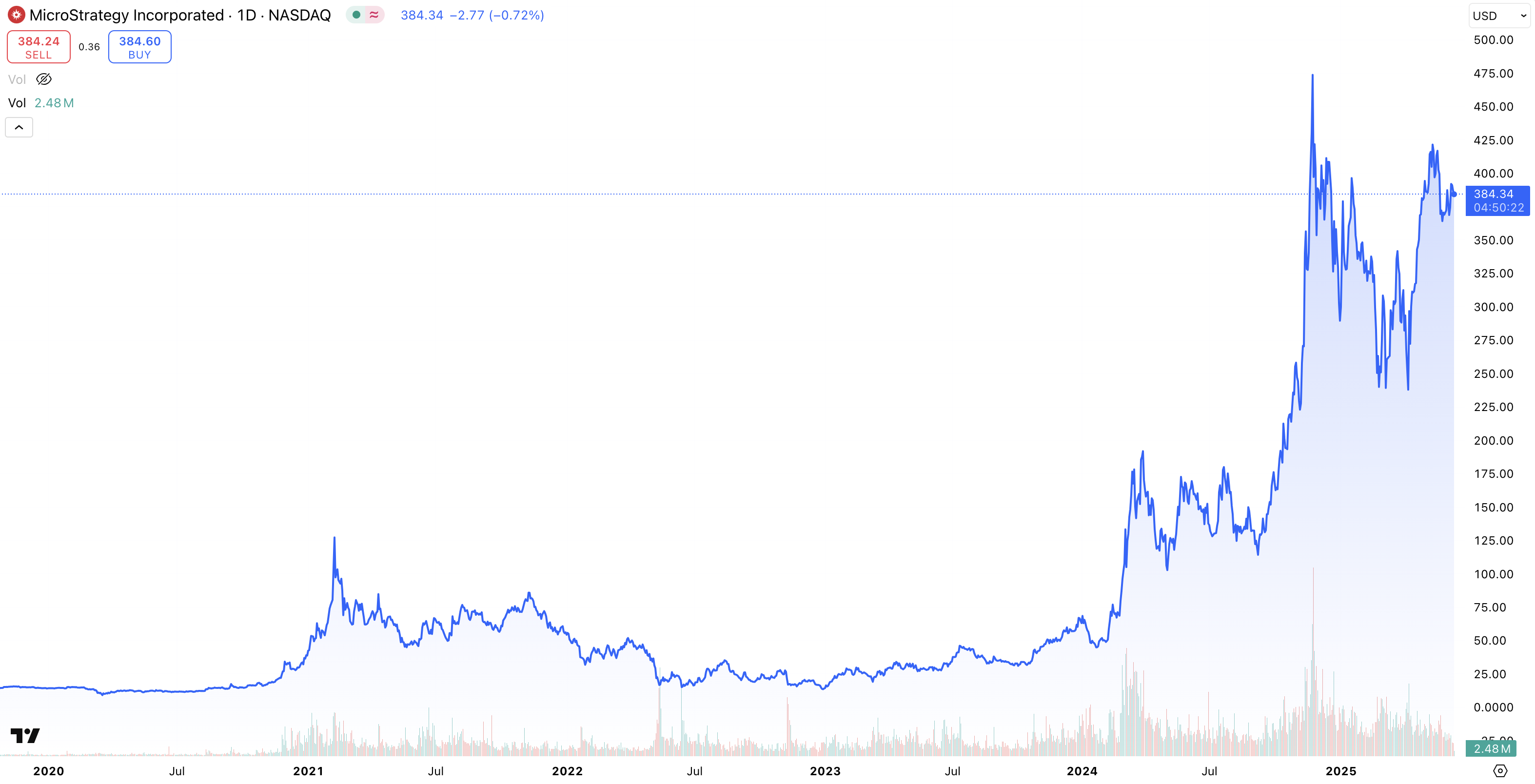 Under perioden 2020 till 2025 har Strategys aktiekurs stigit med kolossala 3 362 %, vilket ger en årlig genomsnittlig ökning på cirka 103 %. Det överträffar tydligt utvecklingen för S&P 500-indexet, som vuxit med ungefär 15 % per år under samma tidsperiod.