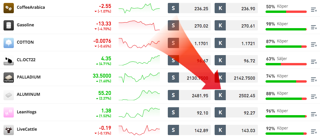 När du har pengar på ditt konto kan du välja aluminium som investering. Sök efter aluminum och klicka på köpknappen.