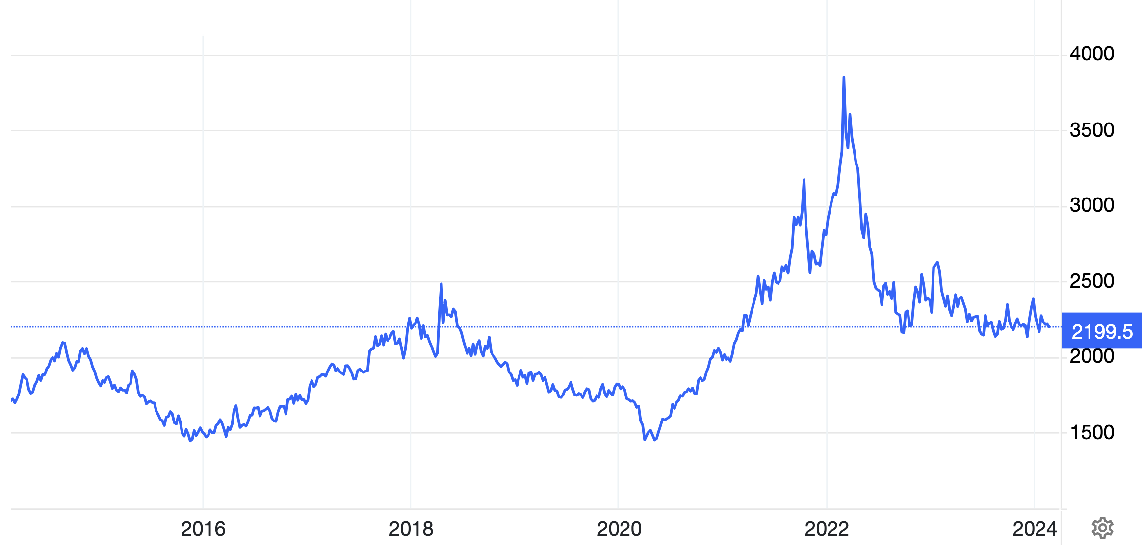 Aluminiumprisets utveckling 2014 – 2024 (USD / ton):