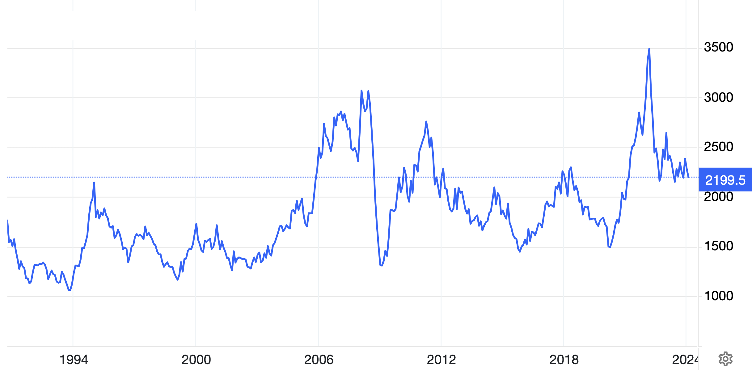 Aluminiumprisets utveckling 1990 – 2024 (USD / ton):