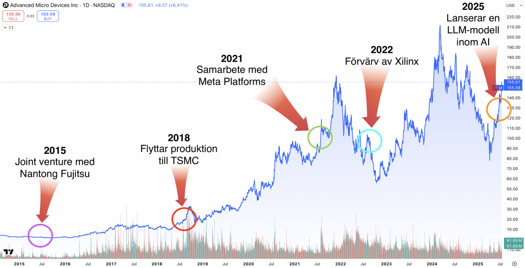 I följande kapitel granskar vi hur AMD:s aktiekurs har utvecklats under perioden 2015 till 2025. Vi lyfter fram fem nyckelhändelser som haft stor betydelse för bolagets resa och diskuterar hur dessa påverkat aktiens marknadsvärde och investerarnas syn på bolaget över tid.
