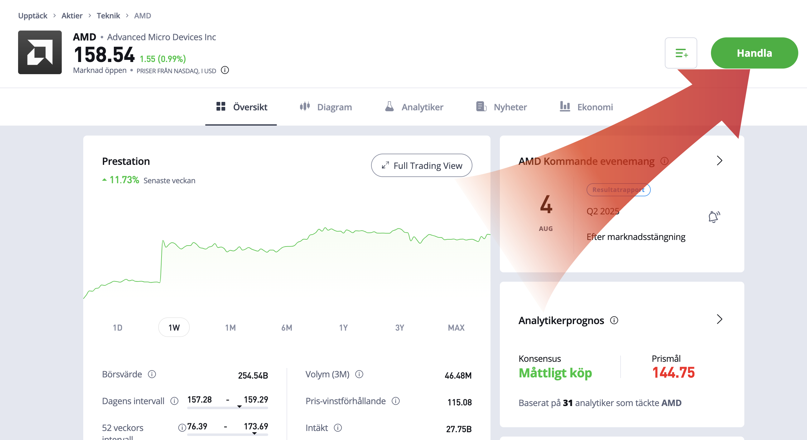 Om du vill investera i AMD kan du göra det smidigt via välkända nätmäklare som eToro eller Avanza. Bolagets aktie handlas på den amerikanska börsen med tickern AMD. I denna guide går vi bland annat igenom hur du steg för steg köper aktier i bolaget. Läs mer i kapitel 5.