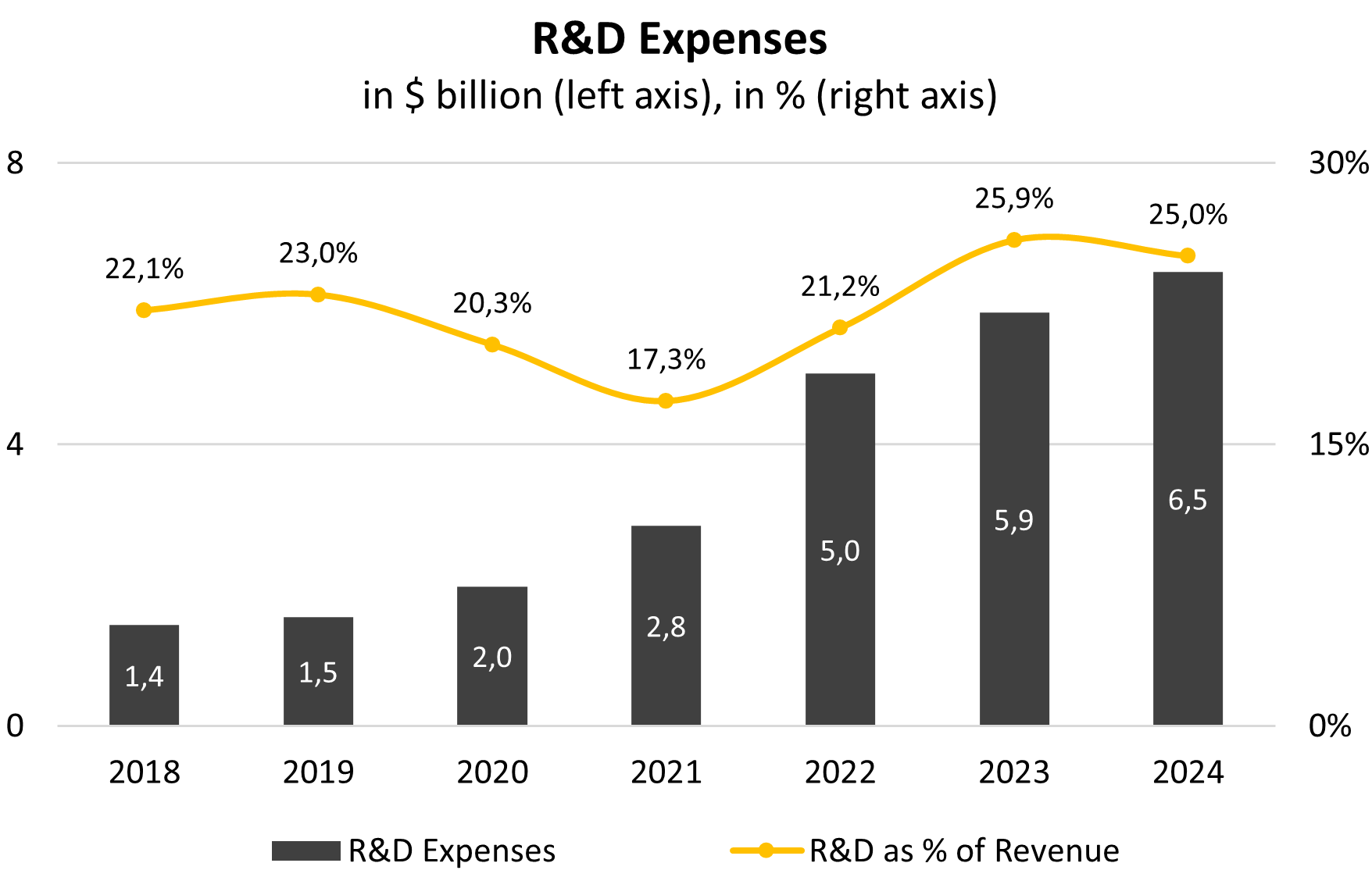 Som går att se ökade utgifterna från 1,4 miljarder USD år 2018 till 6,5 miljarder USD år 2024. Som andel av intäkterna låg nivån runt 20 % de första åren, men steg kraftigt från 2022 och låg på 25 % år 2024.