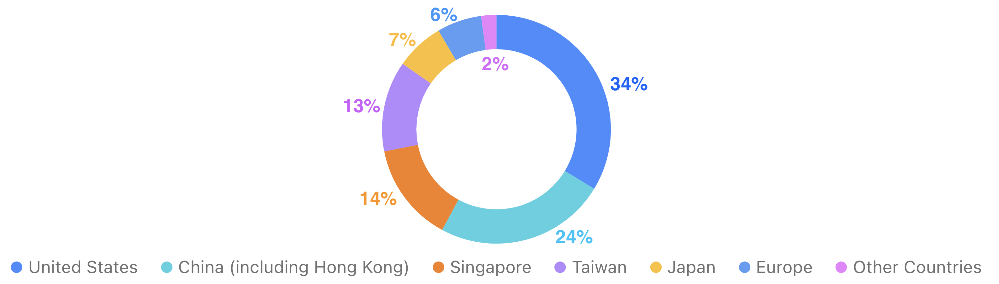 Cirkeldiagrammet ovan visar hur AMD:s intäkter fördelas geografiskt under 2024. Den största delen av försäljningen kom från USA (34 %), följt av Kina (inkl. Hongkong) med 24 %. Därefter kommer Singapore och Taiwan, som stod för 14 % respektive 13 % av intäkterna.