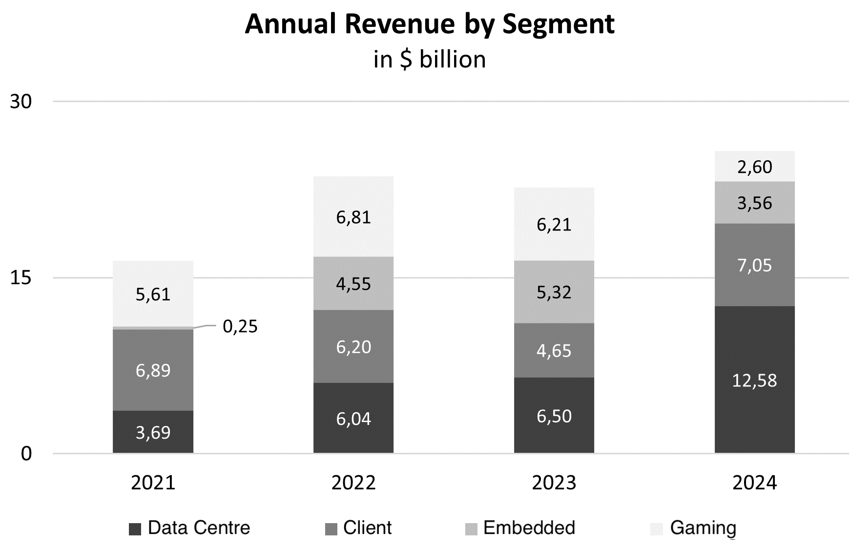 Segmentet “Client” har också ökat under perioden och nådde 7,05 miljarder USD år 2024, motsvarande 27 % av den totala omsättningen. Intäkterna från “Embedded” och “Gaming” har minskat med tiden. De stod för 14 % respektive 10 % av intäkterna år 2024.