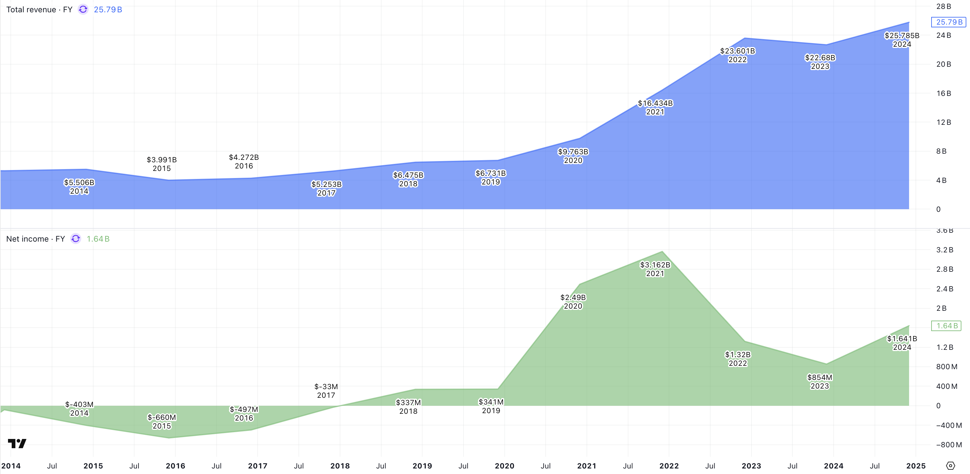Vinsten vände från minus till plus 2018, med en topp 2021 då både försäljning och marginaler var mycket starka. Efter 2022 sjönk vinsten till följd av ökad konkurrens, minskad efterfrågan inom “Gaming” och högre kostnader.