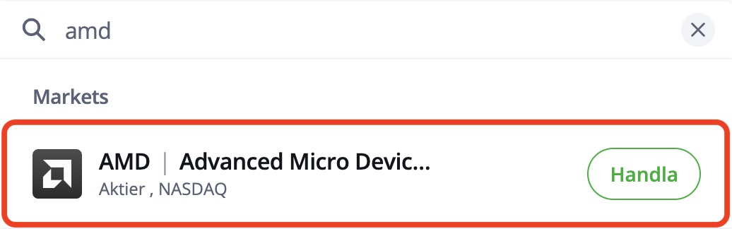 Har du pengar på ditt konto? Då klickar vi på sökknappen, söker efter AMD aktie.