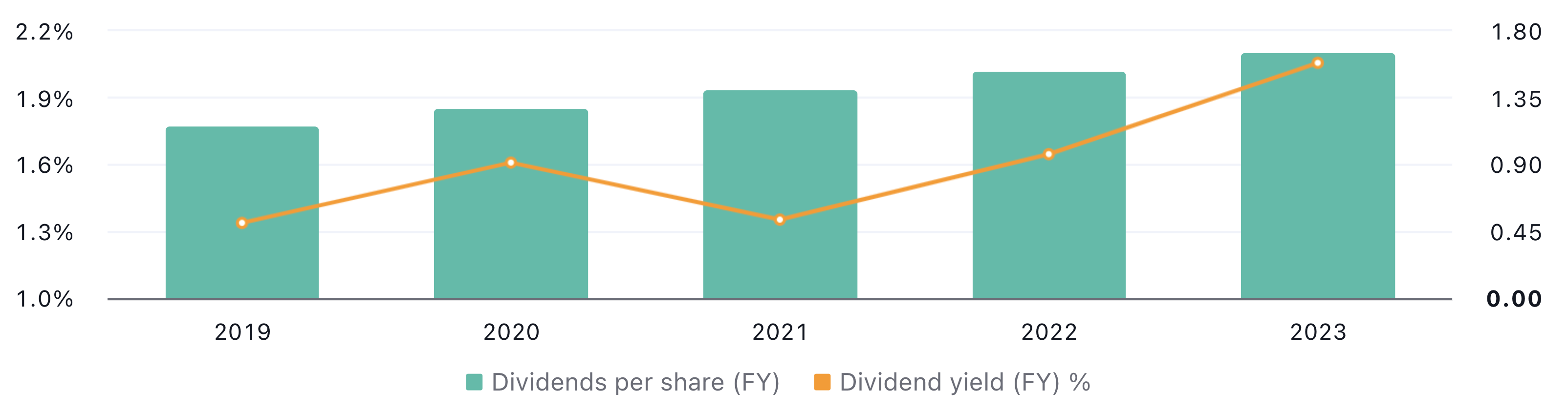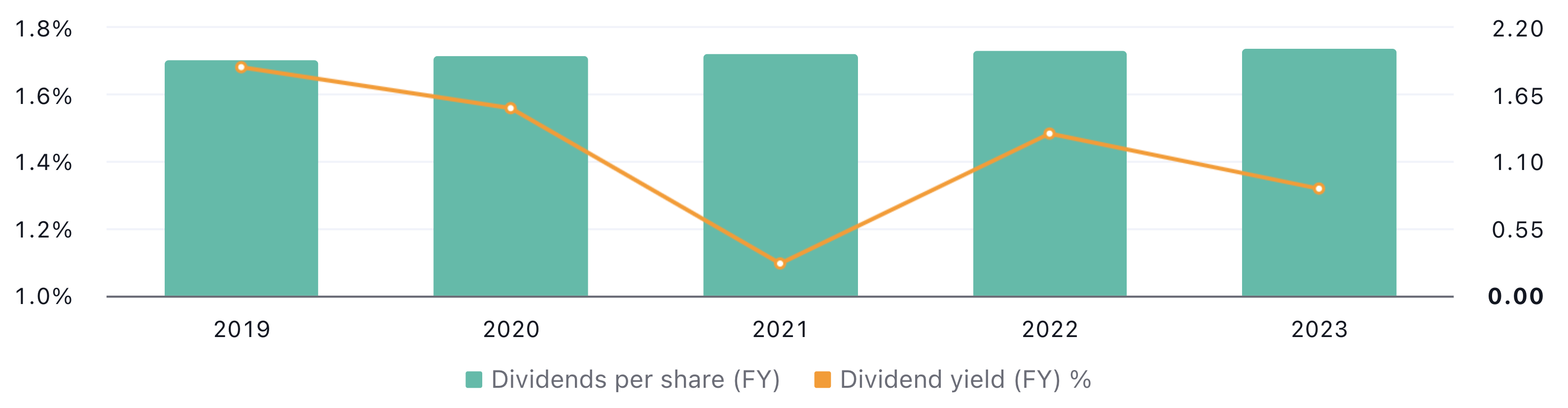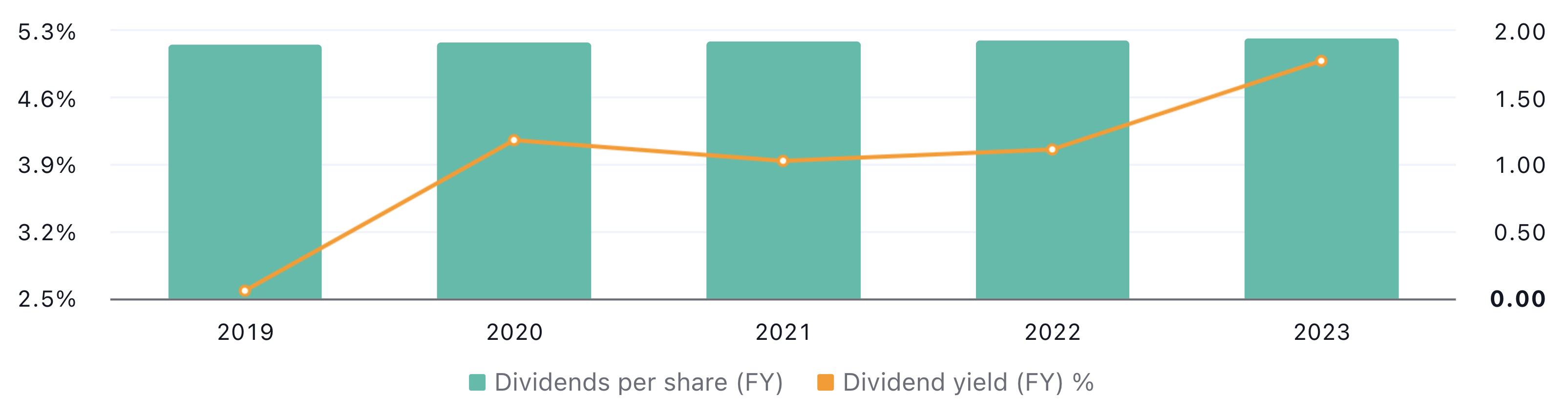 Stapeldiagrammet ovan visar på Northwest Natural Holdings utdelningshistorik. För räkenskapsåret 2019 uppgick utdelningen till 1.90 USD per aktie. År 2023 uppgick den istället till 1.94 USD. Det är lika med en ackumulerad genomsnittlig tillväxt på cirka 0.50 % per år.
