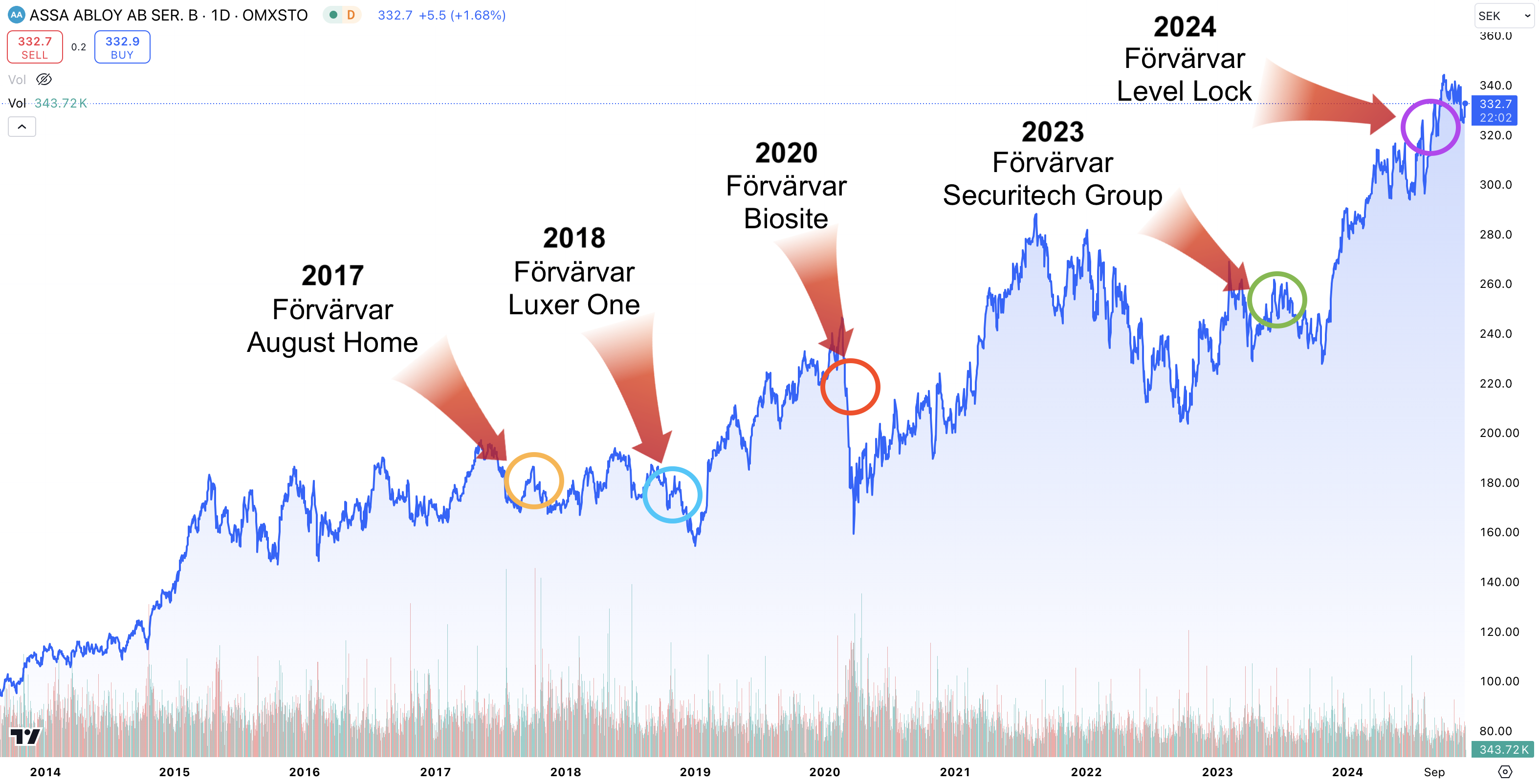 Diagrammet nedan visar hur Assa Abloys aktiekurs har utvecklats under perioden 2014 till 2024. I diagrammet visas även 5 viktiga händelser, som haft stor påverkan på bolagets resultat och aktiekurs. Utförligare beskrivningar av dessa presenteras i texten nedanför diagrammet.