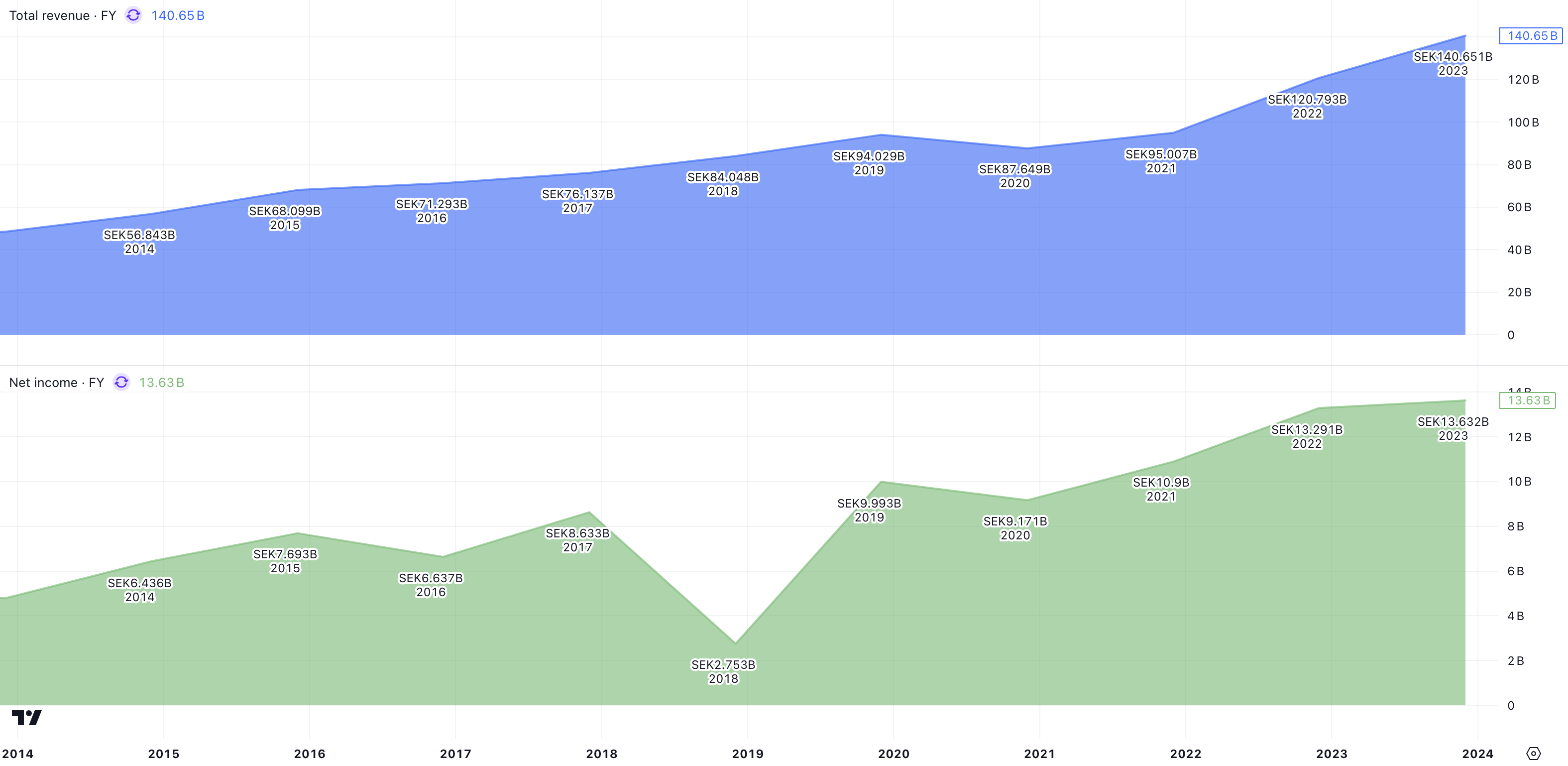 Grafen ovan är tagen från TradingView och visar Assa Abloys stadiga tillväxt i både omsättning och nettovinst mellan 2014 och 2023.