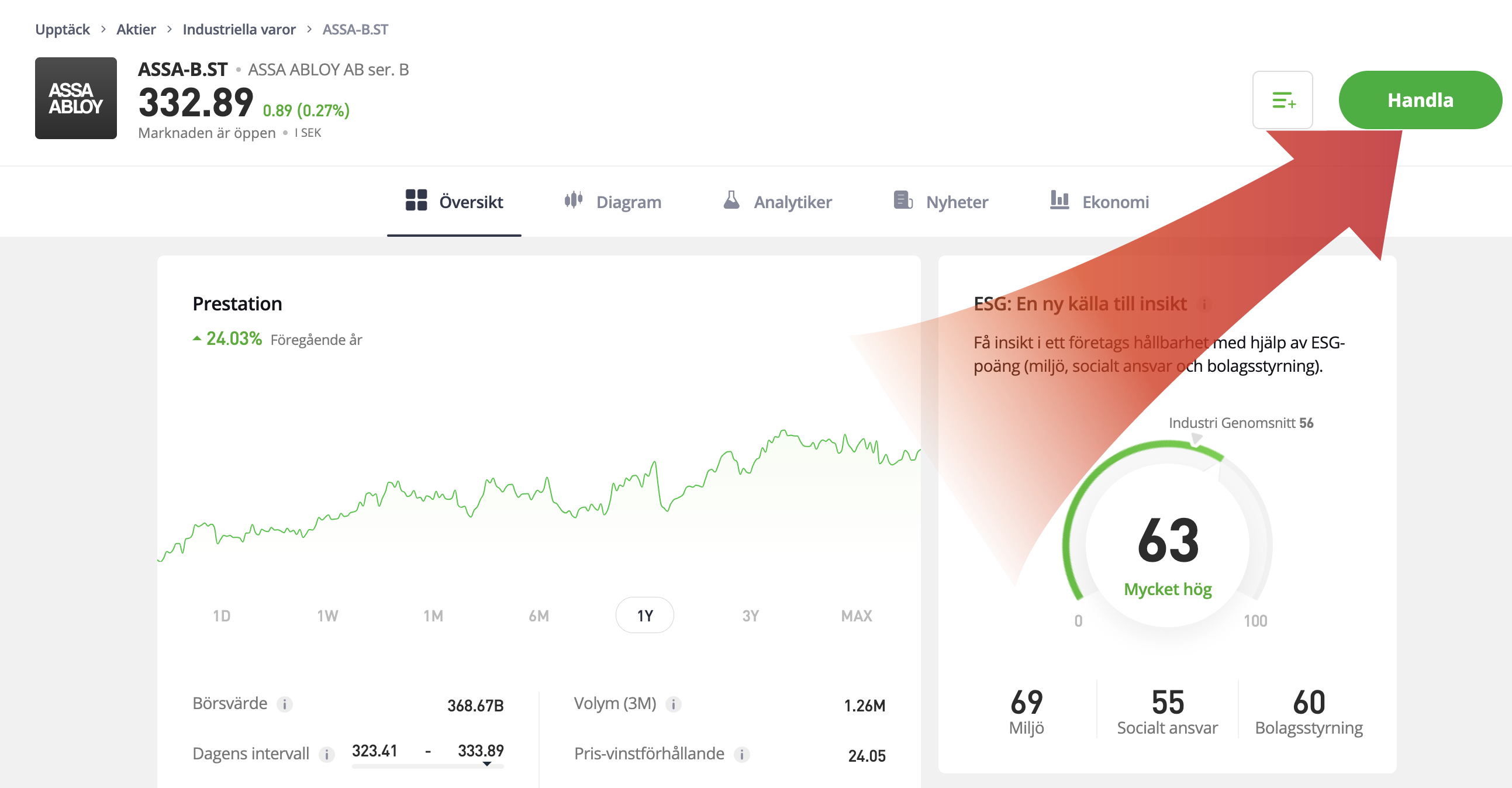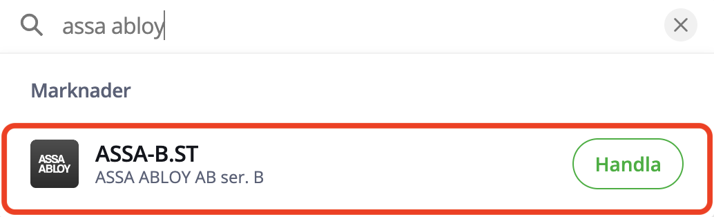 Har du pengar på ditt konto? Då klickar vi på sökknappen, söker efter Assa Abloy aktie.