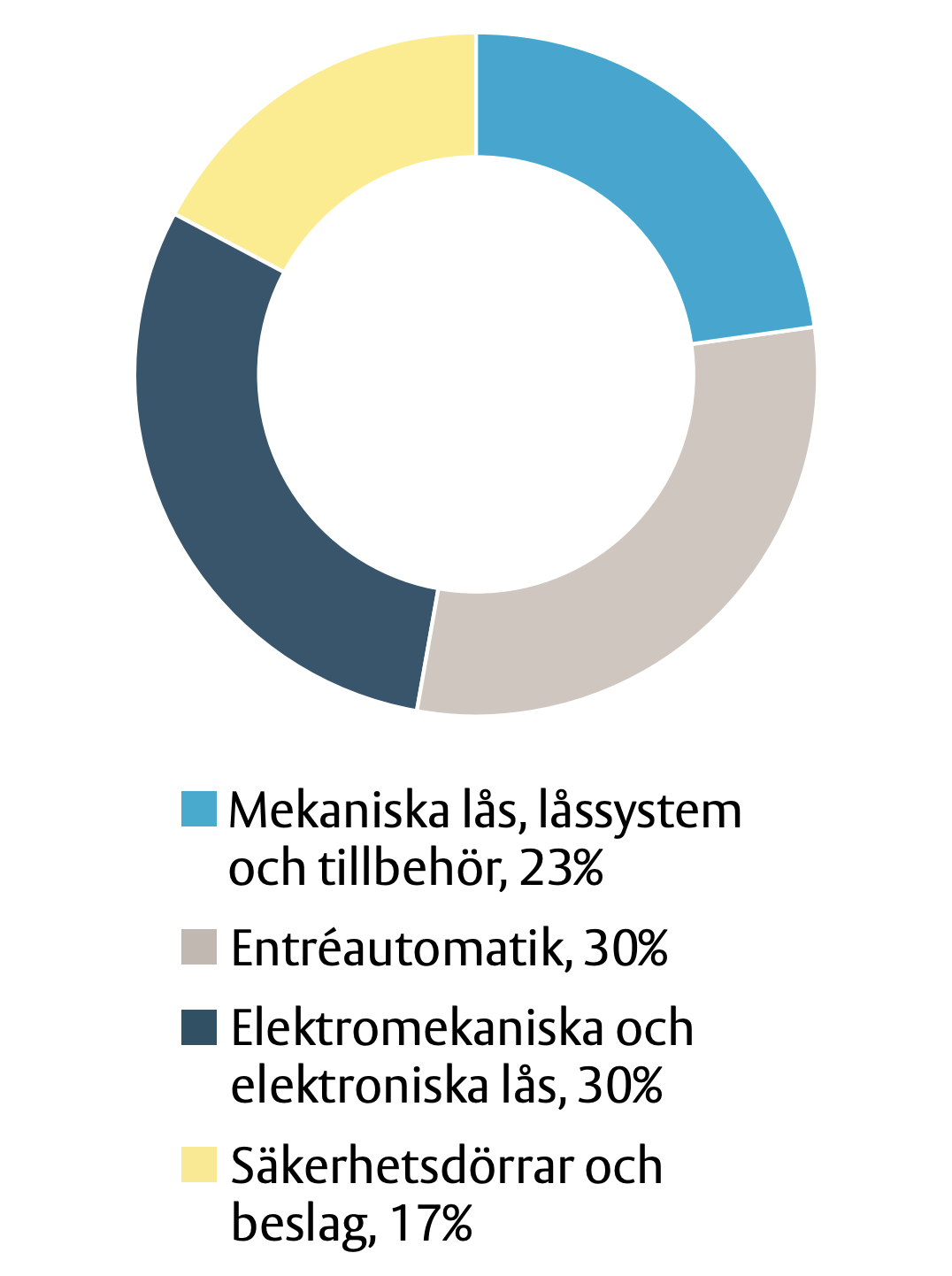 De största segmenten utgörs av “Entréautomatik” och “Elektromekaniska och elektroniska lås”. De står för 30 % vardera av den totala omsättningen. Segmenten omfattar automatiska dörrlösningar samt digitala och elektroniska låssystem som ofta används i både kommersiella och privata miljöer.