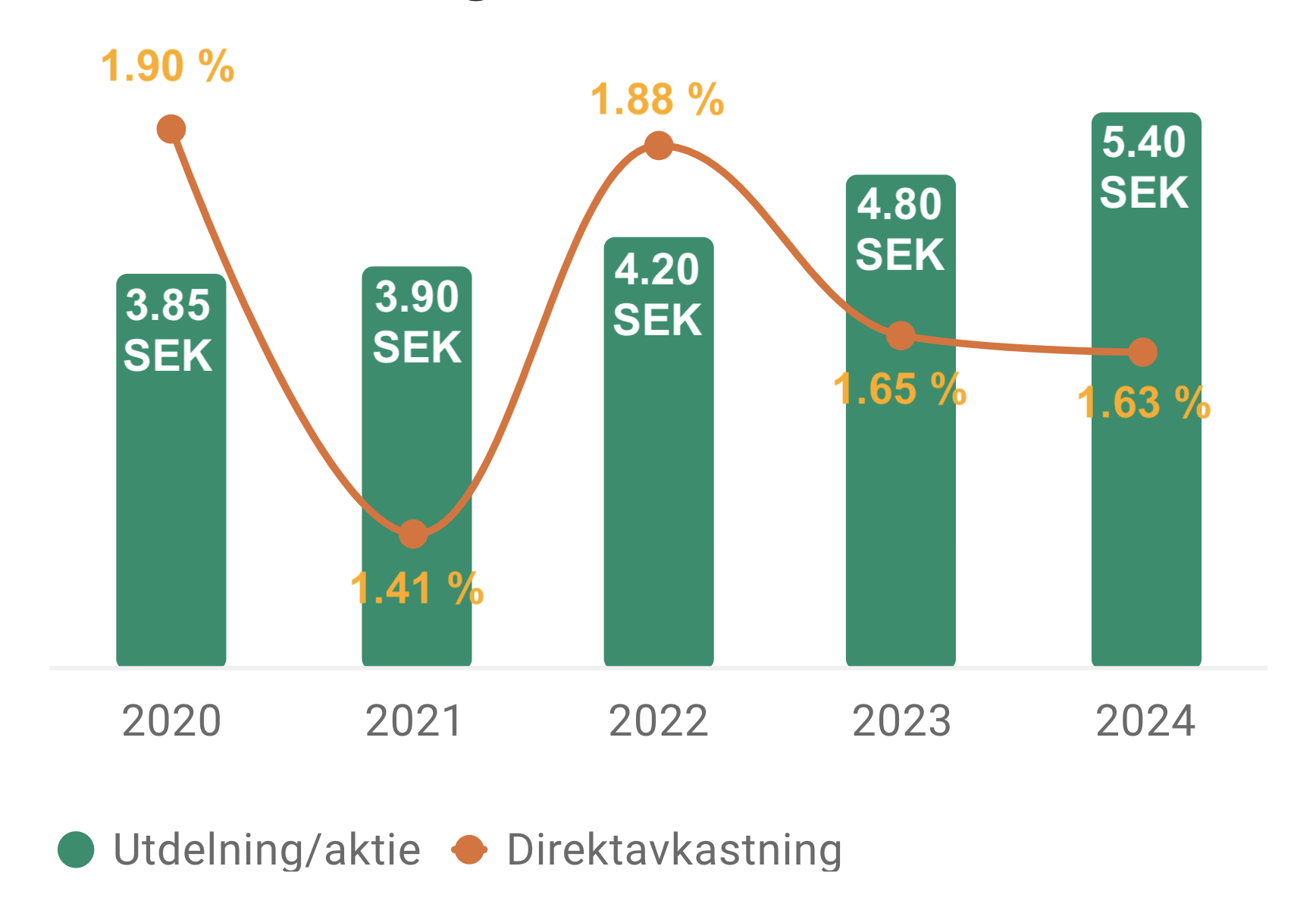 Bilden ovan visar Assa Abloys utdelningshistorik från 2020 till 2024. Den har varit stadigt stigande under perioden och växt från 3.85 SEK till 5.40 SEK per aktie. Det motsvarar en genomsnittlig årlig tillväxttakt på cirka 7 %. Assa Abloy har historiskt delat ut mer än 40 % av sin vinst.