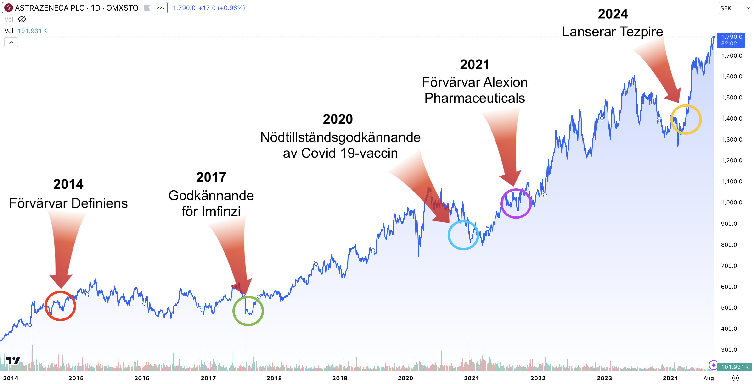Det här kapitlet presenterar en sammanfattning av hur AstraZenecas aktiekurs utvecklats mellan åren 2014 och 2024. I grafen nedan visas även 5 betydande händelser som har haft en inverkan på företagets resultat och aktiekurs. Mer detaljerad information om dessa händelser går att läsa längre ner efter grafen.