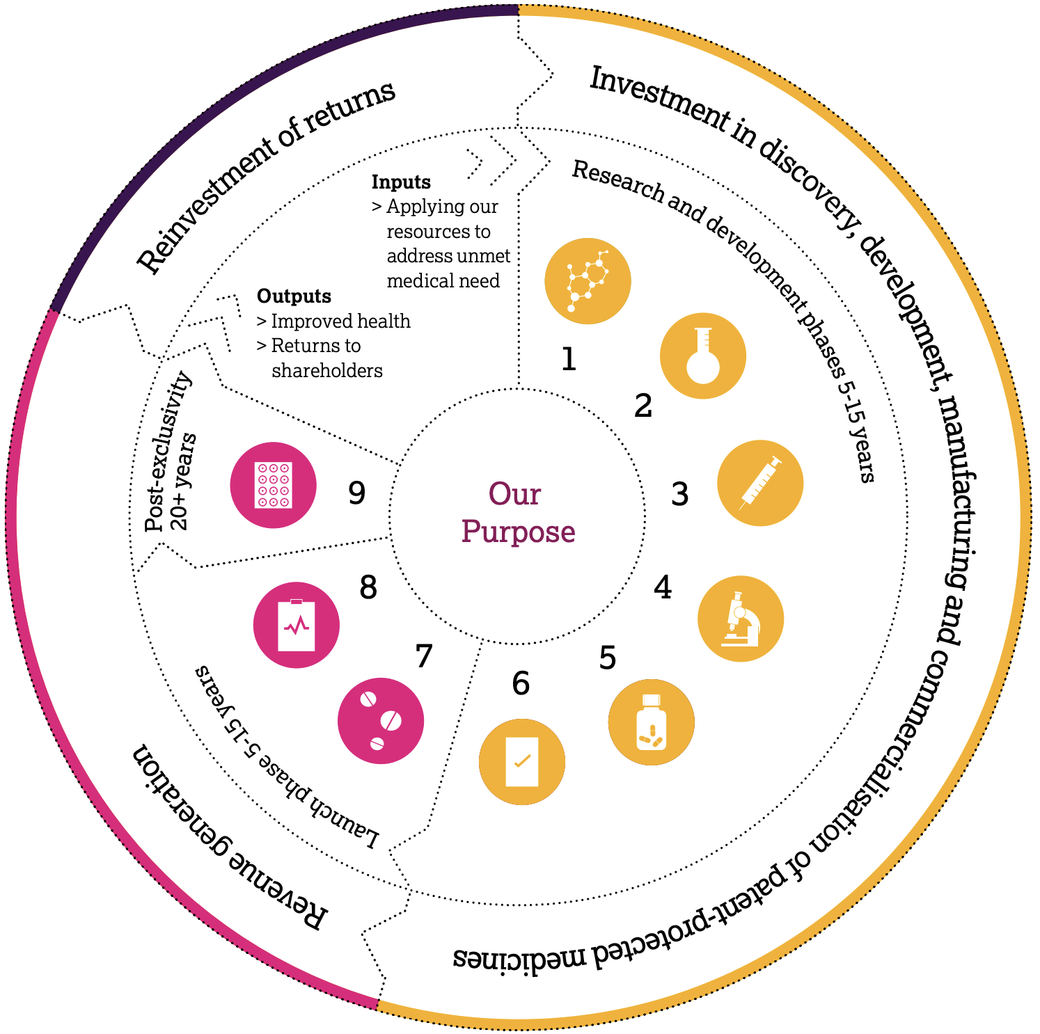 3. Återinvestering – En del av de pengar som blir över från verksamheten går återigen in i bolaget. Pengarna läggs på forskning och utveckling för att ta fram framtidens läkemedel.