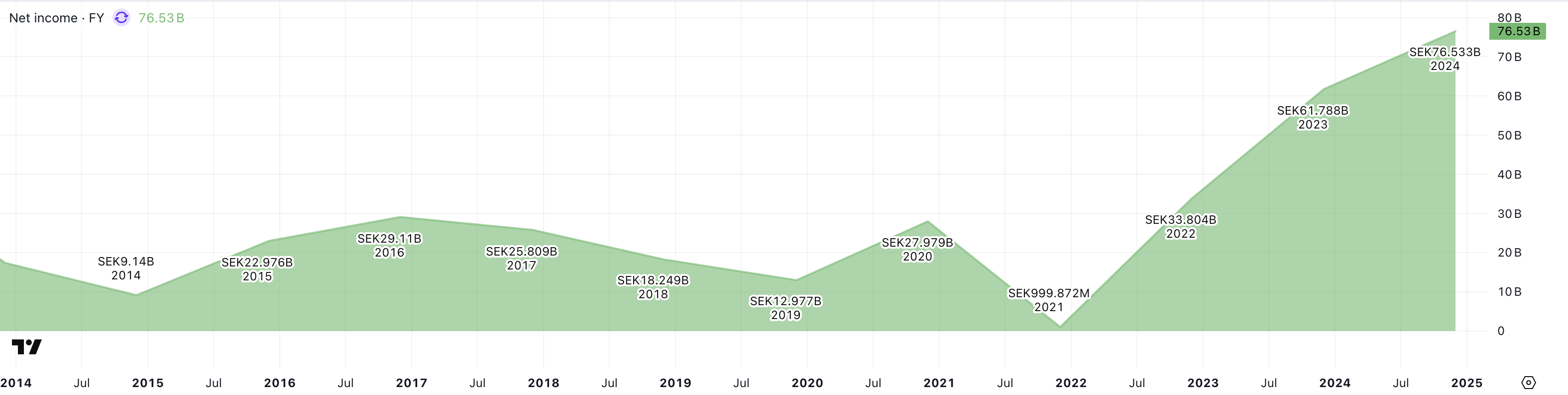 År 2014 redovisade AstraZeneca en vinst på 9 miljarder SEK. Fram till år 2024 hade vinsten hunnit öka till nästan 77 miljarder SEK. Det betyder att bolagets vinst har vuxit med ungefär 24 % per år.