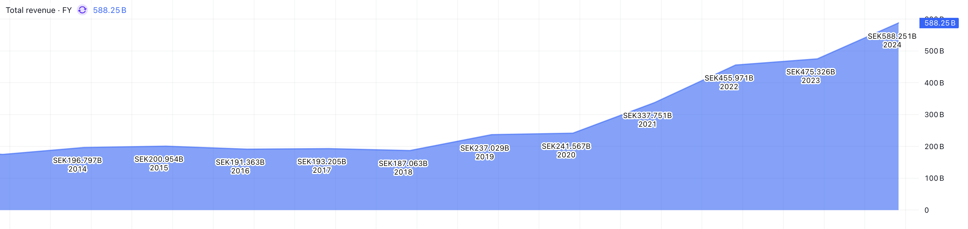 År 2014 hade AstraZeneca en omsättning på 197 miljarder kronor. Till år 2024 hade den ökat till 588 miljarder SEK. Det betyder att bolagets omsättning har vuxit med ungefär 12 % per år.