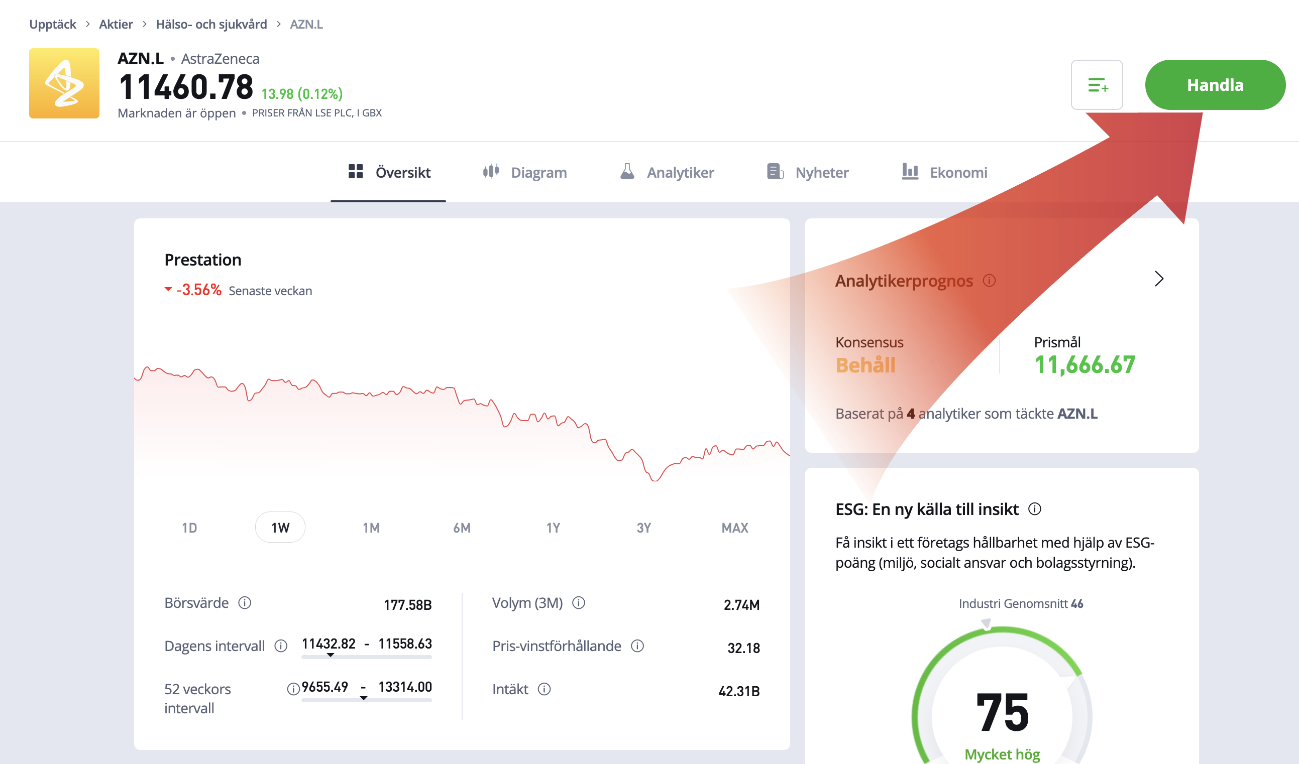 AstraZeneca kan handlas hos eToro och Avanza. Bolaget är börsnoterat på både Stockholmsbörsen och Londonbörsen. Längre ner går vi igenom hur du handlar AstraZeneca (AZN) i Sverige på 5 minuter. Läs mer i kapitel 5.