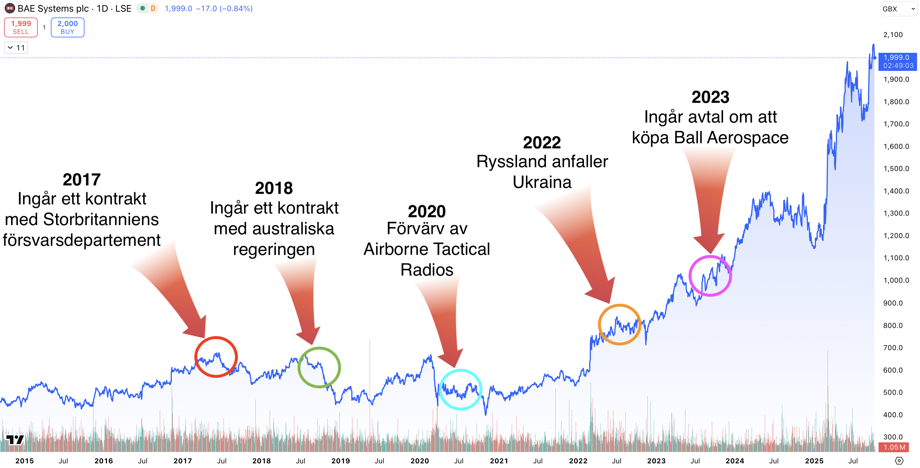 Nedan visas BAE Systems aktiekursutveckling mellan 2015 och 2025. Förutom att visa hur aktiekursen rört sig under perioden markeras även fem viktiga händelser som haft betydande inverkan på bolagets strategiska riktning. Dessa händelser – såsom nya försvarskontrakt, stora förvärv och internationella samarbeten – speglas tydligt i aktiens utveckling över tid.