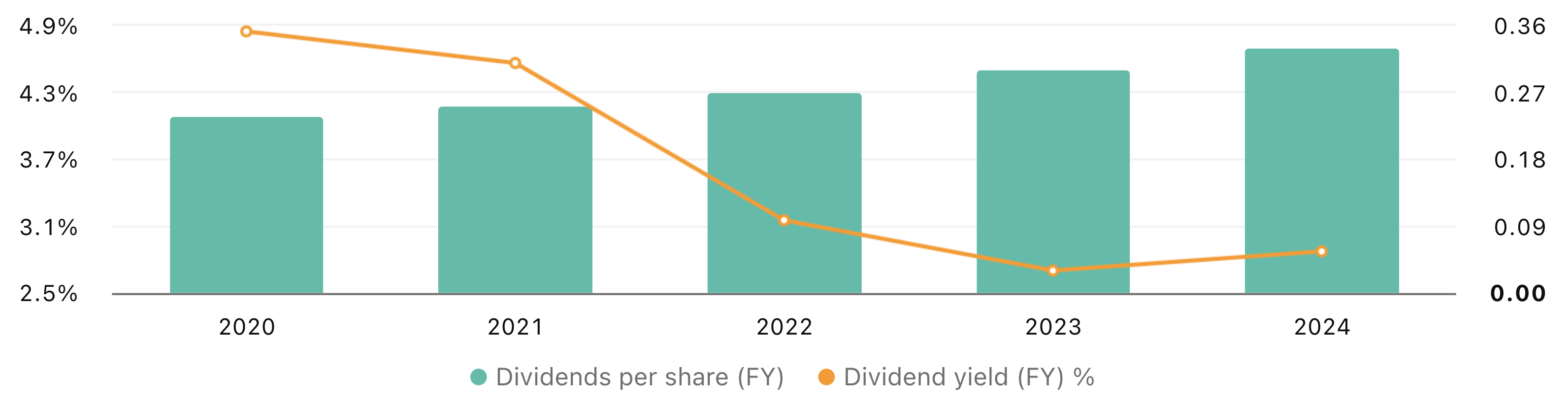 Samtidigt har direktavkastningen sjunkit från omkring 4.80 % år 2020, till strax under 3 % år 2024. Det beror främst på att aktiekursen stigit snabbare än utdelningen, vilket gör att avkastningen i procent minskar trots högre utdelning per aktie.