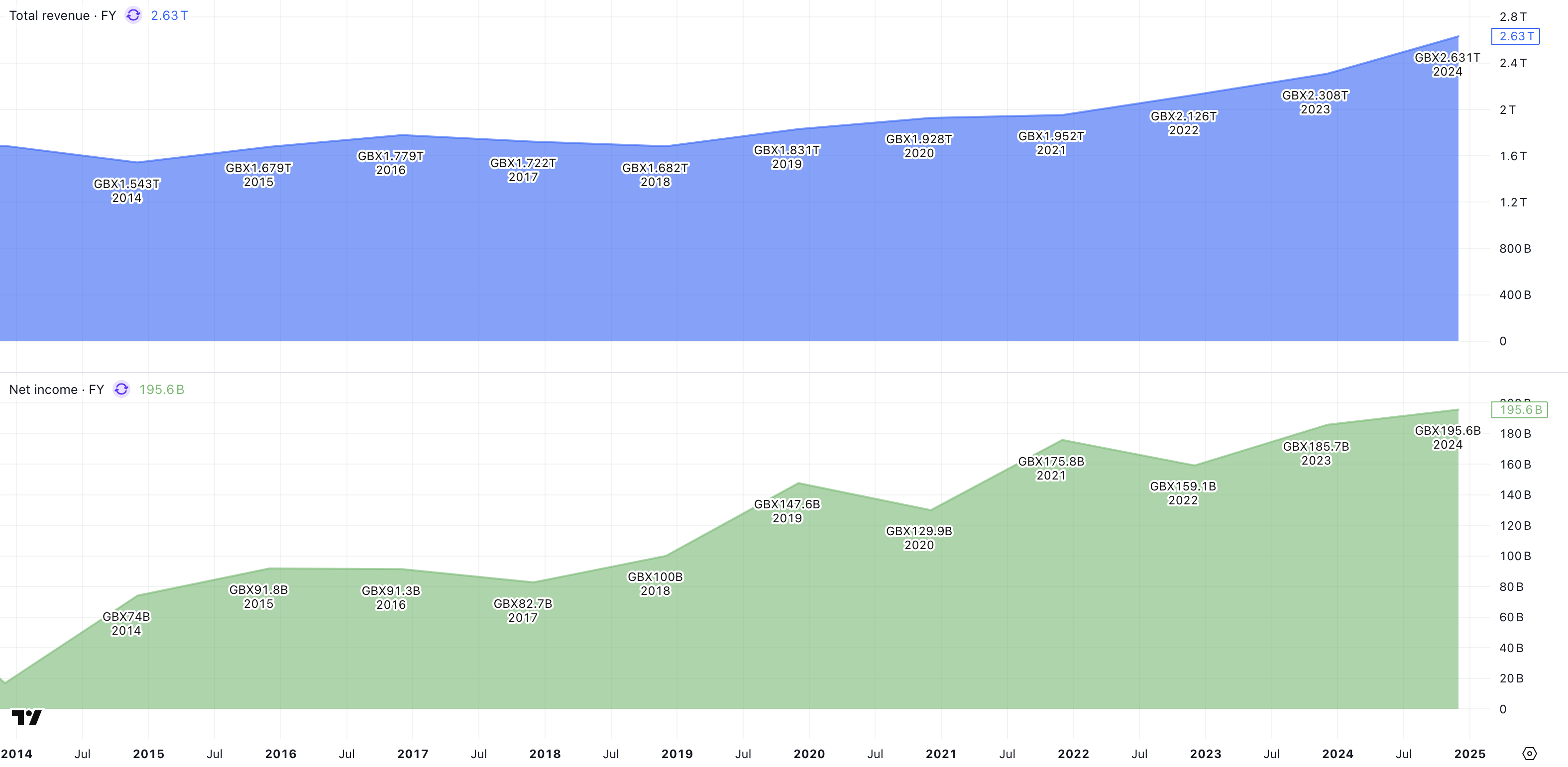 I följande kapitel ges en överblick över BAE Systems omsättnings- och vinsthistorik mellan 2014 och 2024. Vidare tar vi oss en titt på bolagets utdelningshistorik. Alla diagram och information är baserat på data från TradingView.