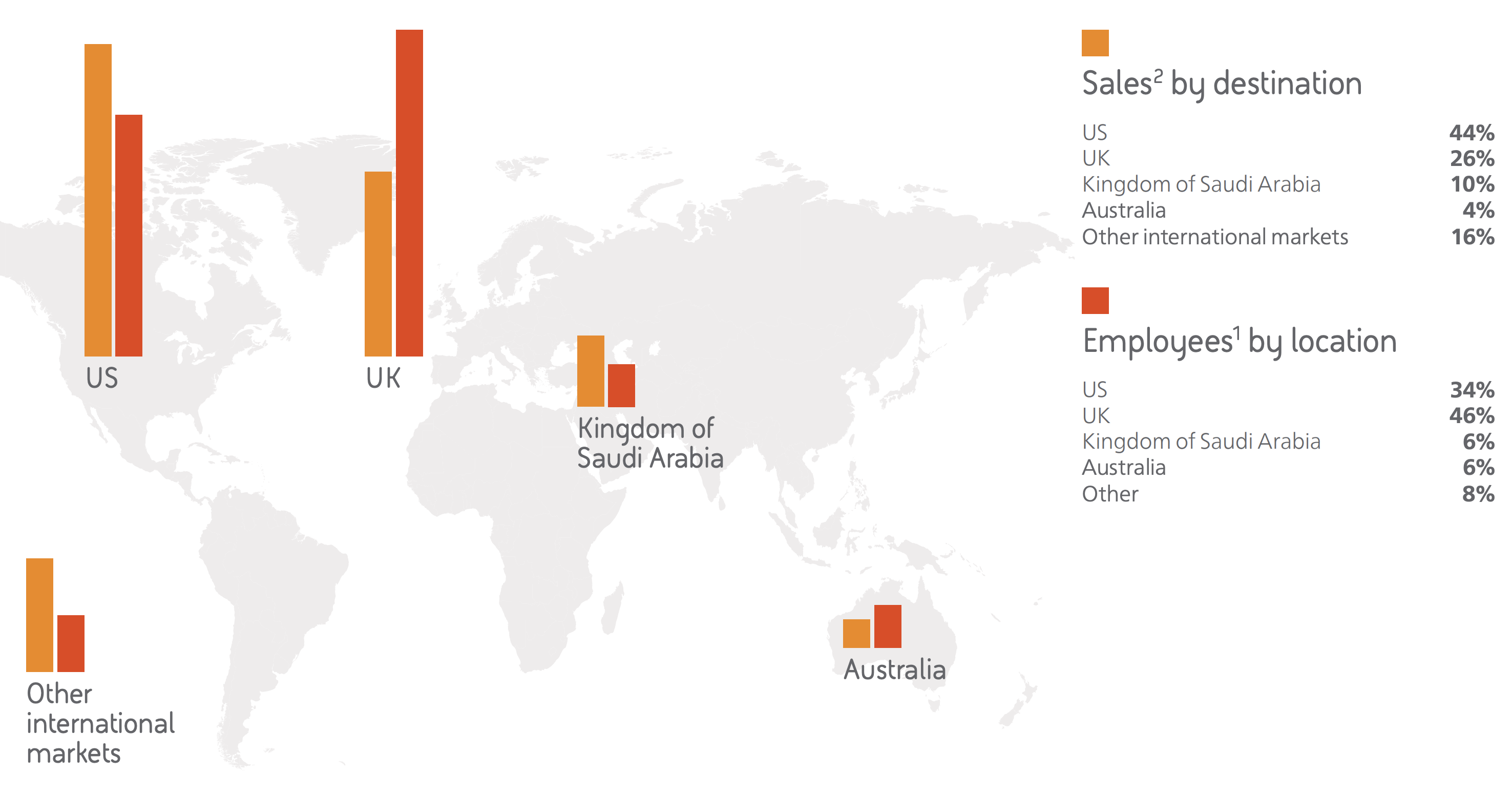 Bilden ovan illustrerar hur BAE Systems försäljning och personalstyrka är geografiskt fördelade. Den visar att USA står för den största delen av försäljningen med 44 %, följt av Storbritannien med 26 %, Saudiarabien med 10 %, Australien med 4 % och övriga internationella marknader med 16 %.
