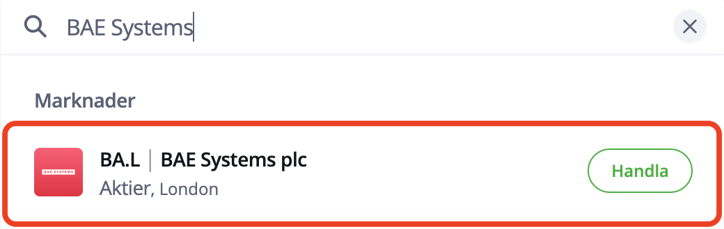 Har du pengar på ditt konto? Då klickar vi på sökknappen, söker efter BAE Systems aktie.