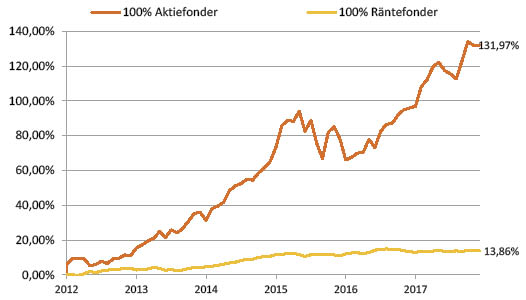 Bilden nedan visar ett tydligt hur aktiefonder är bättre att äga än räntefonder på på lång sikt.