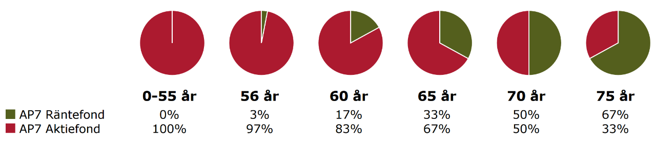 - AP7 Offensiv – Består av 75 % AP7 Aktiefond och 25 % av AP7 Räntefond.