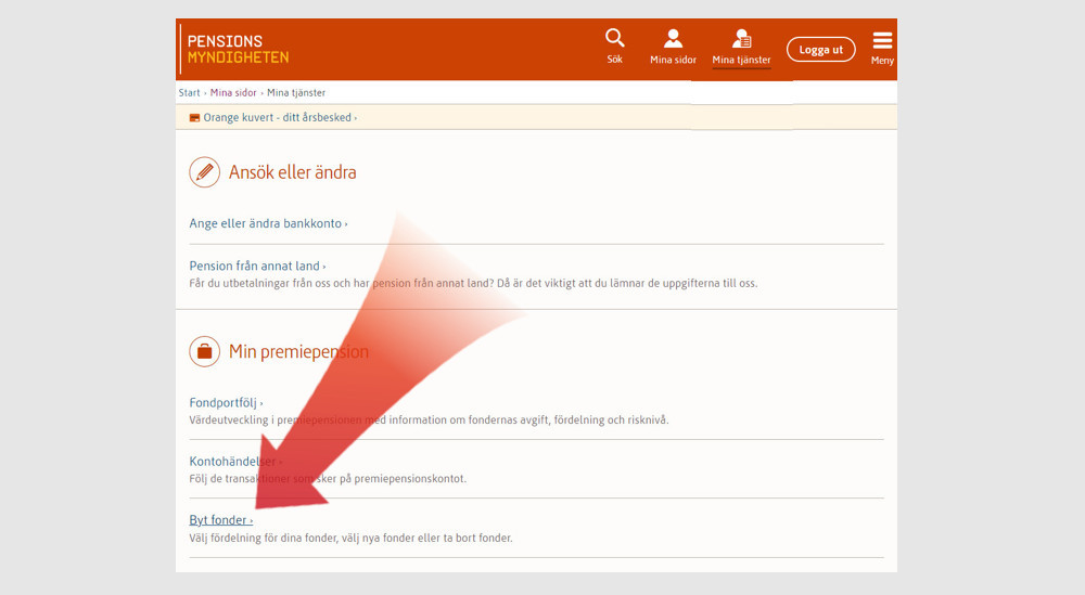 - Efter inloggning, gå till ”Mina tjänster” och välj ”Byt fonder” under rubriken ”Min Premiepension”.