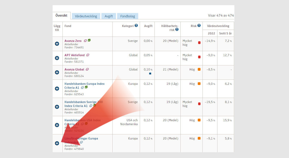 - Lägg till önskade fonder genom att klicka på ”plustecknet” bredvid fondens namn och ange hur stor procentuell andel av ditt kapital som ska placeras i varje fond.