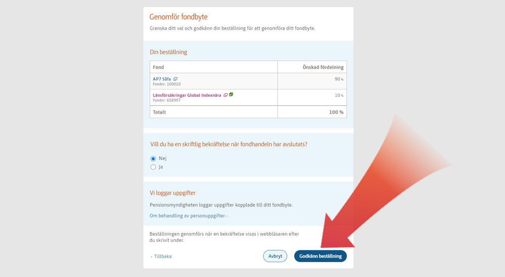 - Granska din nya fondportfölj och bekräfta genom att klicka på ”Godkänn beställning”. Signera därefter med ditt Mobila BankID.