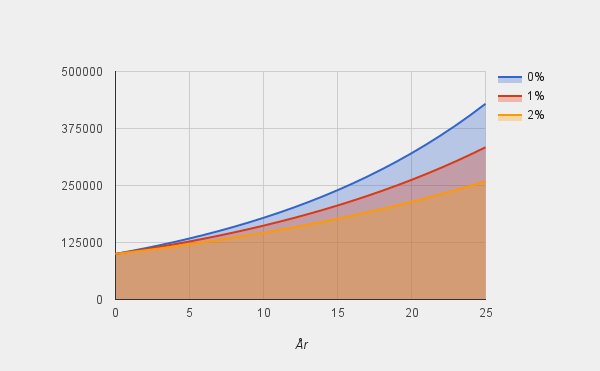 Slutresultatet av att investera 100 000 kr i tre fonder blir annorlunda beroende på om förvaltningsavgiften är 0.00 %, 1.00 % eller 2.00 %. En förvaltningsavgift på 2.00 % betyder att kapitalet är värt 259 000 kr efter 25 år. Om avgiften istället är 1.00 % är slutresultatet lika med 334 000 kr. Med en av avgift på 0.00 % blir kapitalet värt 429 000 kr. Alltså 170 000 kr mer än om avgiften ligger på 2.00 % per år.