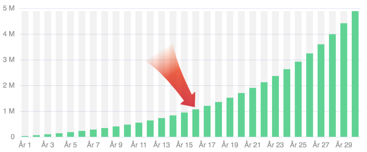 Exempel: Om du har en bruttolön på 30 000 kr kommer dit nettolön efter skatt att bli ca 22 500 kr. Att sätta av 10 % av din nettolön betyder 2 250 kr per månad. Det betyder att med en genomsnittlig avkastning på 10 % per år kommer ditt privata sparande att vara värt lite över 1 mkr efter 16 år. Alltså 10 år snabbare än ditt premiepensionssparande (se bilden nedan).