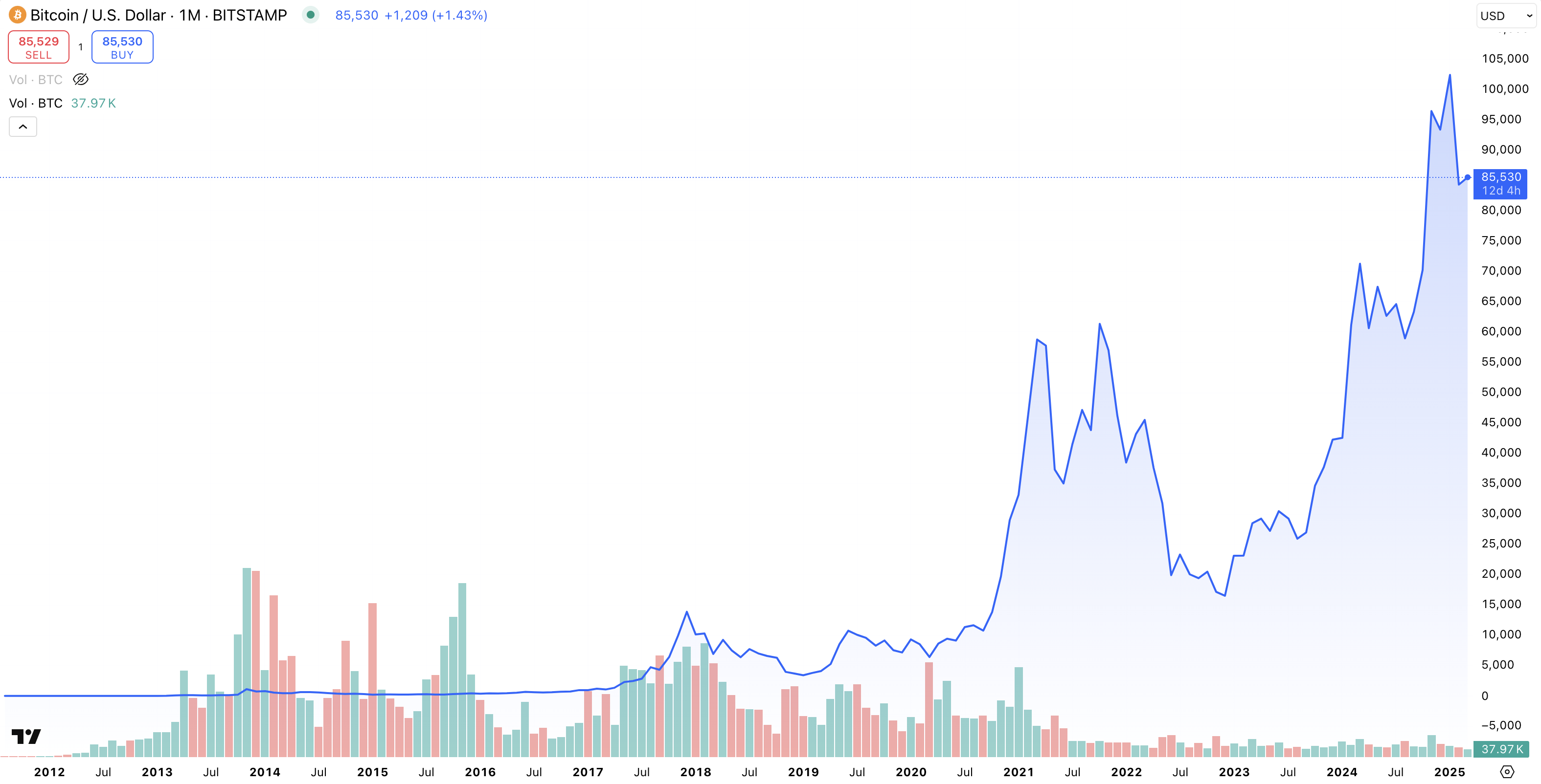 I början av år 2011 var en bitcoin värd 0.30 USD. I början av år 2025 var en bitcoin istället värd 85 000 USD. Det motsvarar en värdeutveckling på 28 333 233 % (över 28 miljoner procent), eller en ackumulerad genomsnittlig avkastning på 130 % per år.
