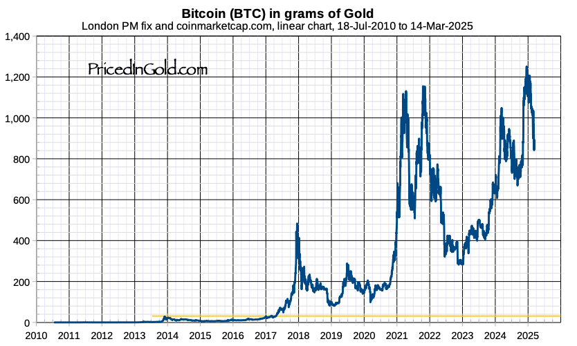 Bitcoin prissat i guld (gram), 2011 – 2025: